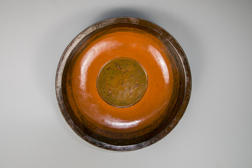 云兽纹漆盘。它具有典型的汉代漆器风格,表髹黑漆,里髹朱漆。唇部口沿处用朱漆绘有一圈卷云纹,内底绘有三条卷曲状云兽纹。这样的漆盘是侯爷生活中不可或缺的日用品类。