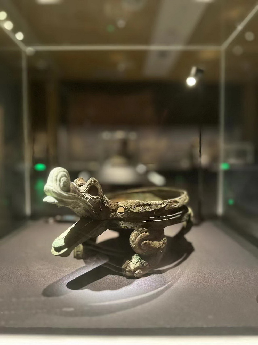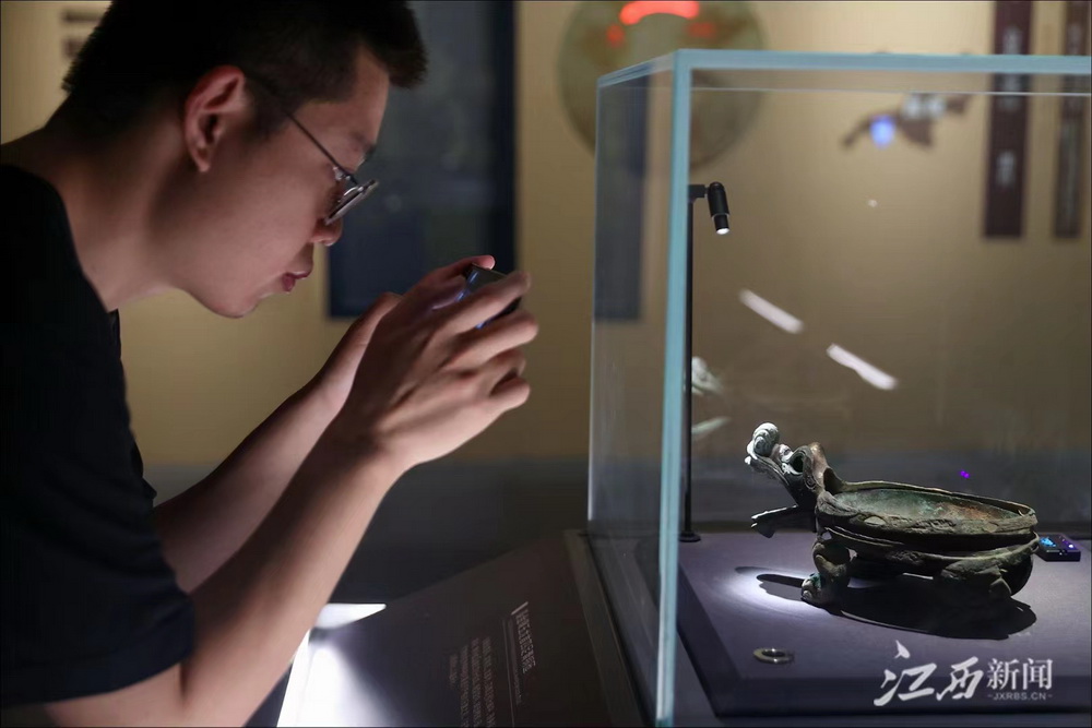镂空方形铁炉、青铜量、瑞兽形青铜镇、云兽纹漆盘、漆耳杯等6件文物经修复后得以更新在“金色海昏”展陈中,现场吸引着众多游客和文物爱好者的目光。博物馆是连接过去、现在的通道,置身其中,仿佛可以回溯千年。