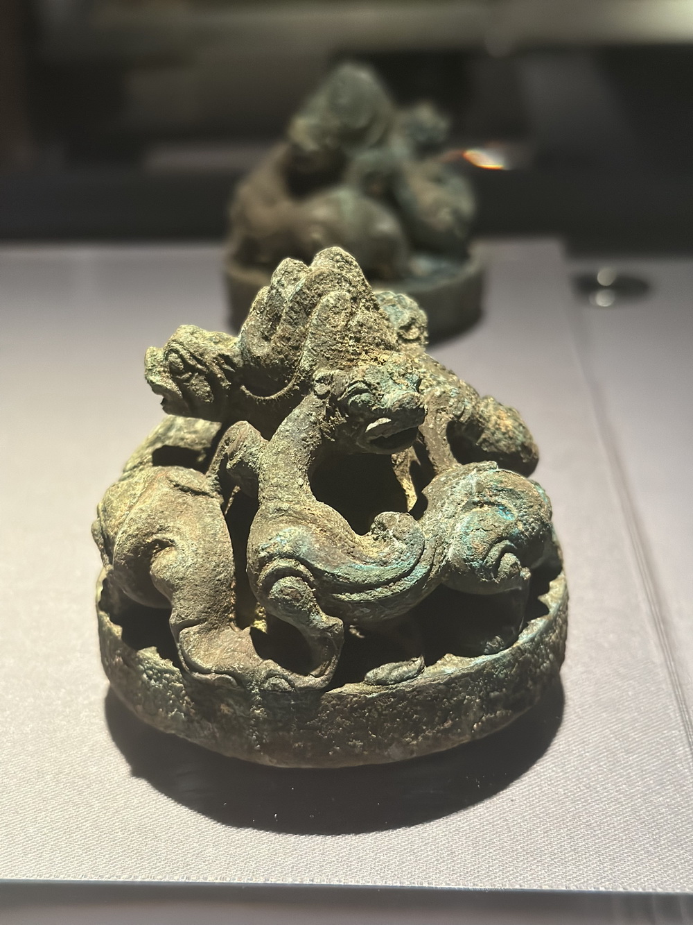 瑞兽形青铜镇。一组4件,形制及大小相同。汉代人席地而坐,青铜镇主要用于镇压席四角,防止席卷起或移动。展出的瑞兽形青铜镇构思巧妙,造型奇特,极具匠心,为汉代青铜镇之佳品。