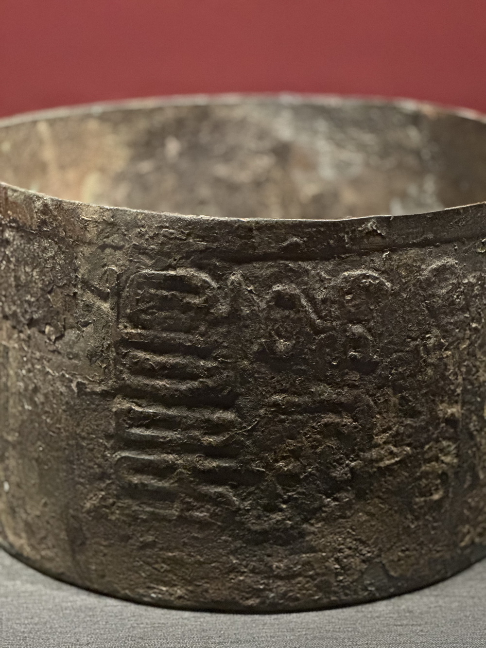 青铜量。该器平底圆筒形,器物上部两侧分别有一圆柱状提手,便于拿放,器表有“昌邑”铭文。量器是古代社会计量农产品多少的主要器具。
