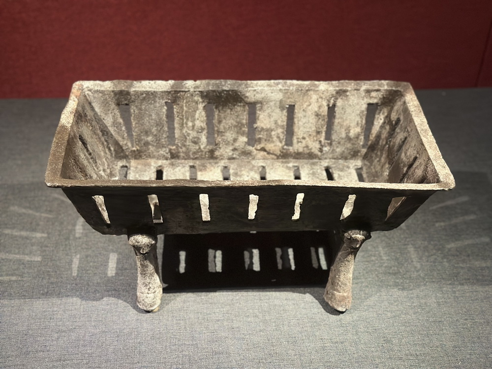 镂空方形铁炉。一种生活用具,该器呈长方形,器壁微斜向内收,器身有多处长方形镂空,下承四足蹄。可能是取暖用具或炙烤炊具。