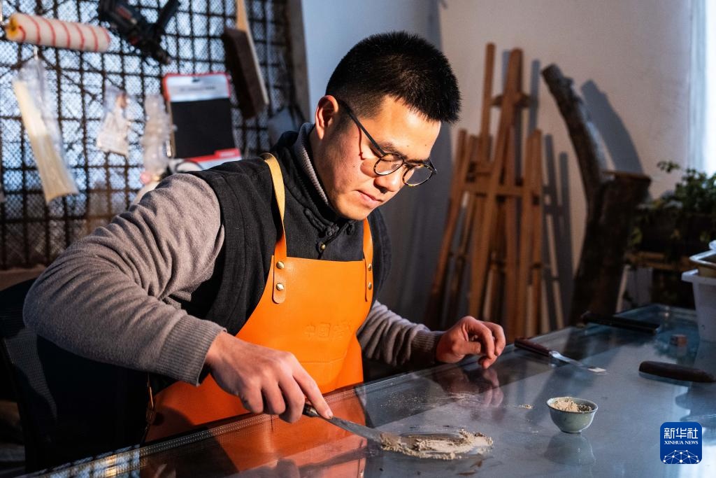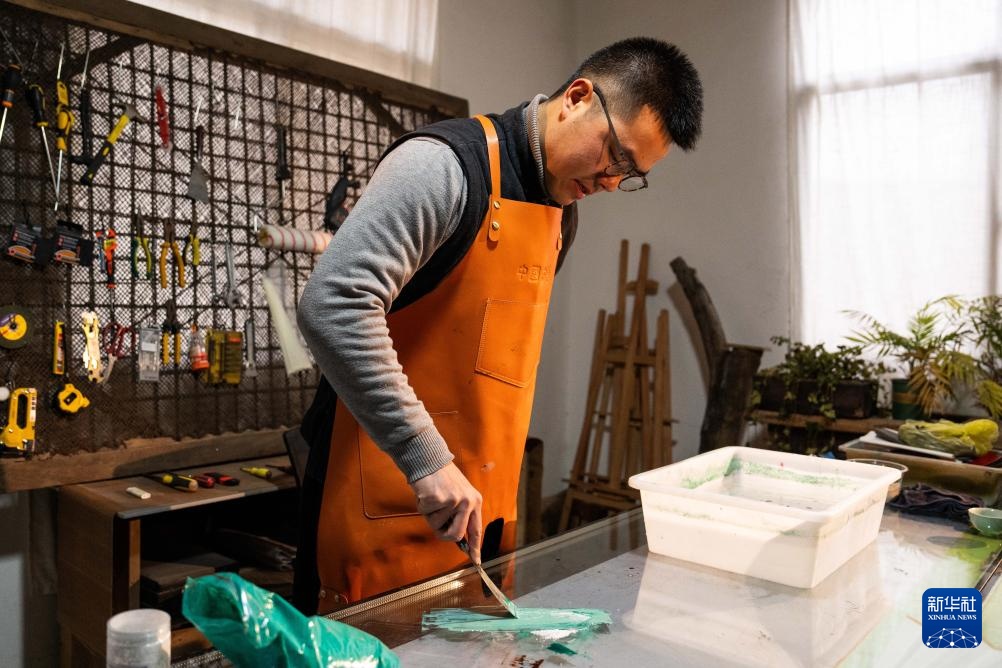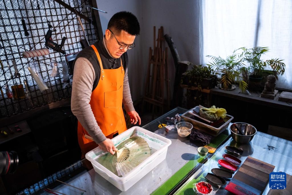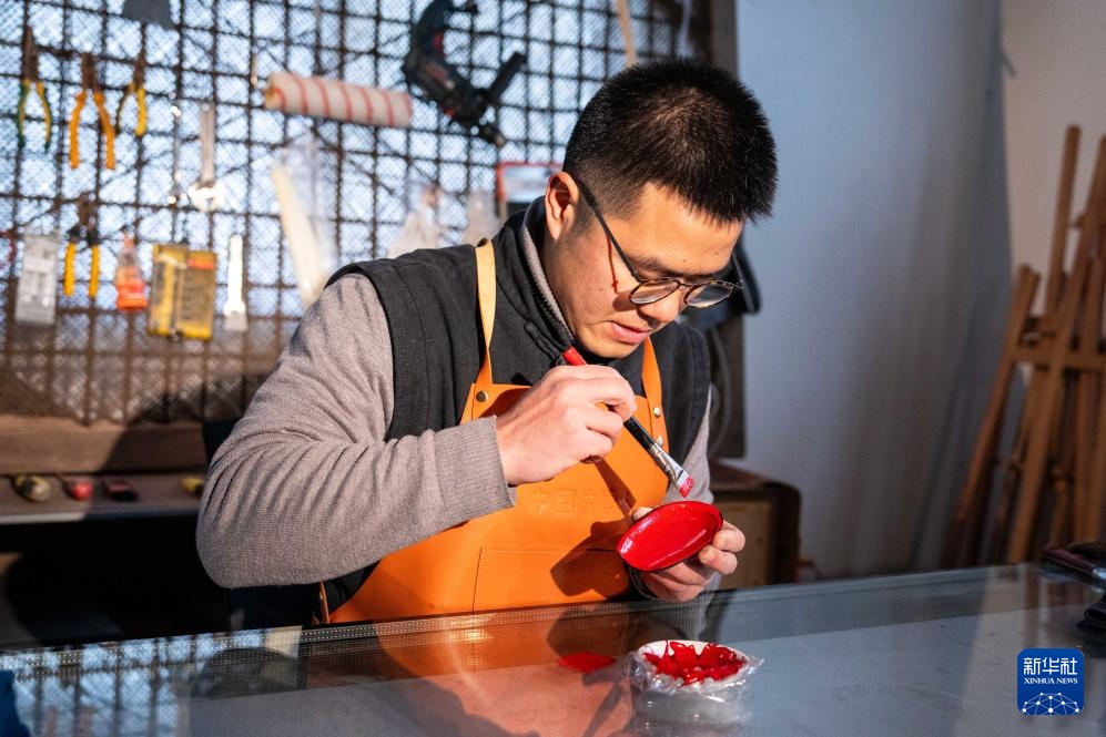 2月28日,郝冠雄在调漆准备做漆扇。