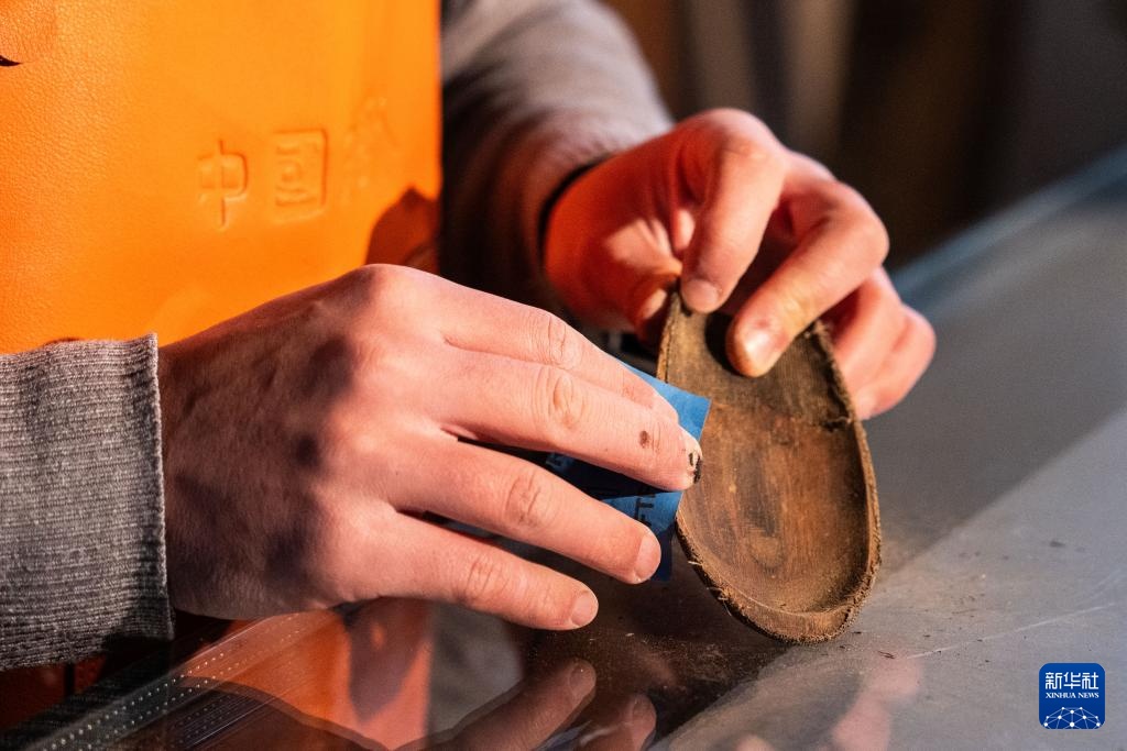 2月28日,郝冠雄在擦漆,为的是让大漆充分渗透到木胎里。
