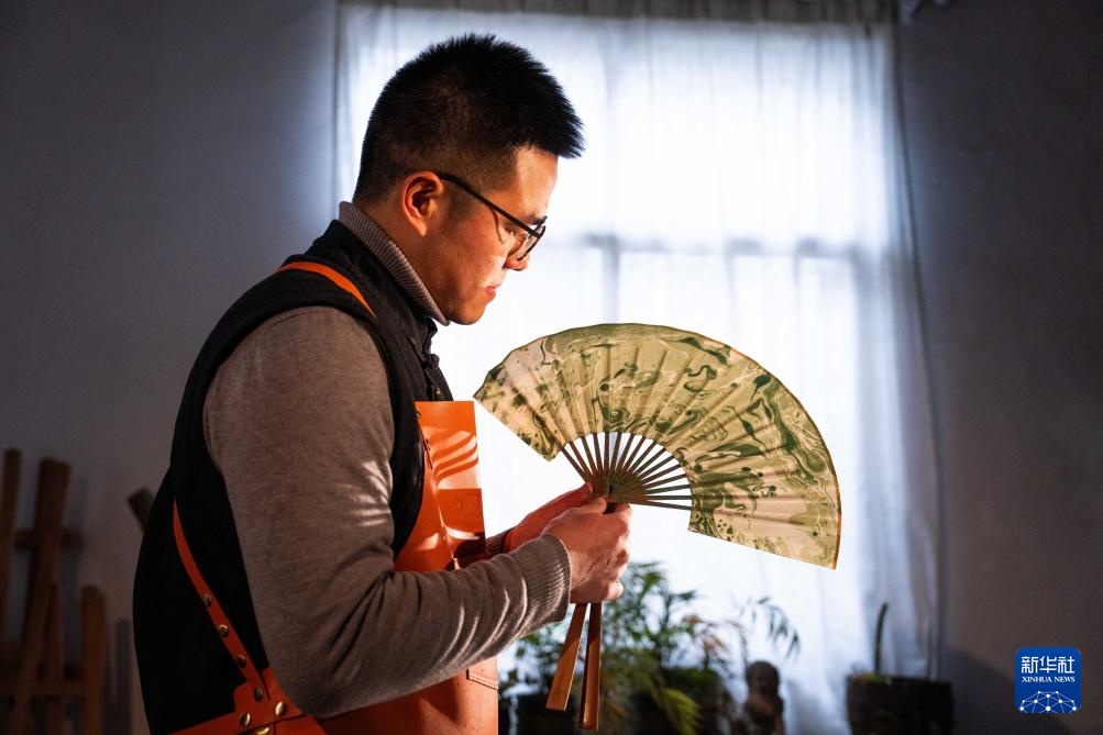 2月28日,郝冠雄在观看漆扇扇面。