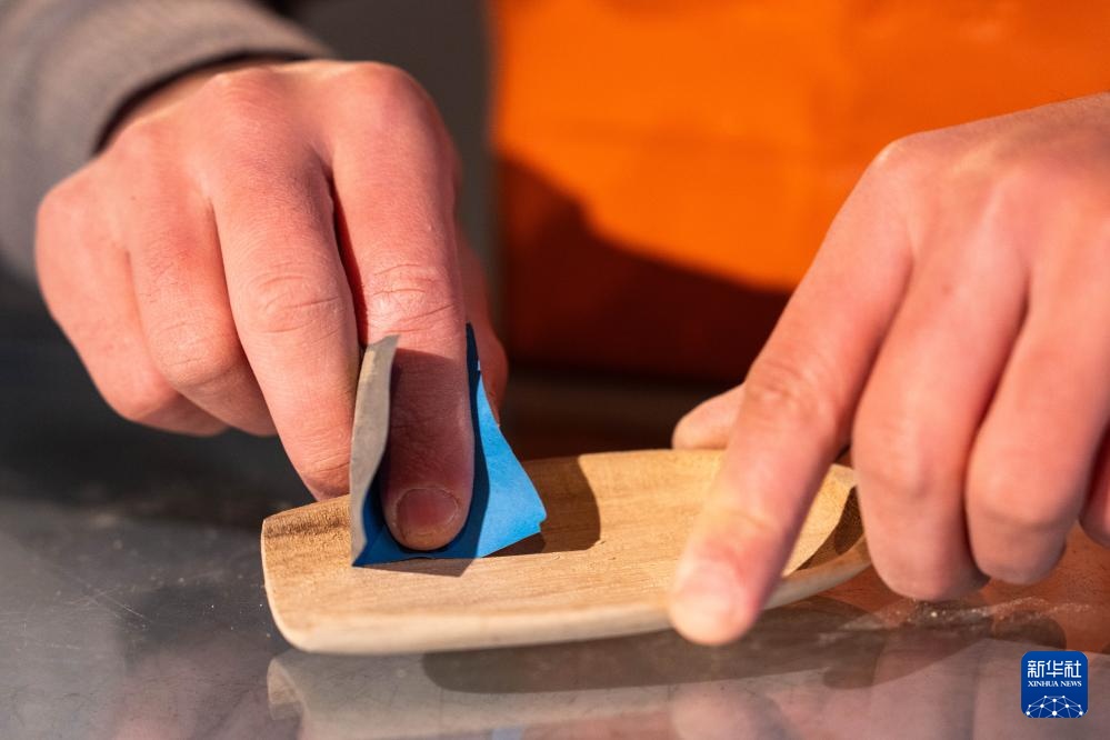2月28日,郝冠雄在打磨茶则木胎。