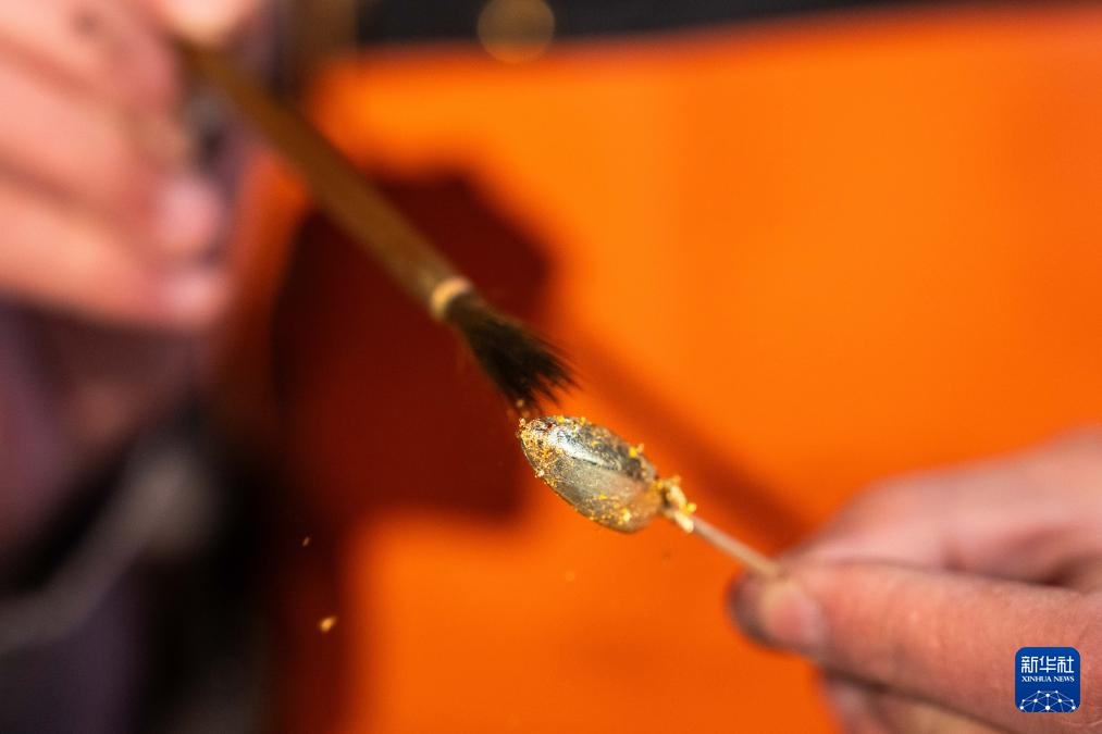 2月28日,郝冠雄给大漆瓜子吊坠包金箔。