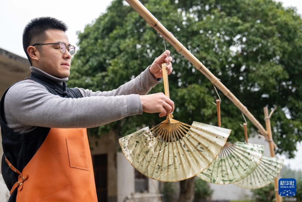 2月28日,郝冠雄在晾晒制作的漆扇。