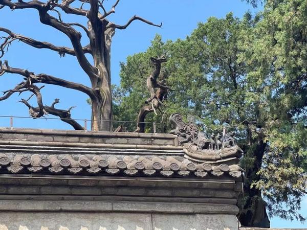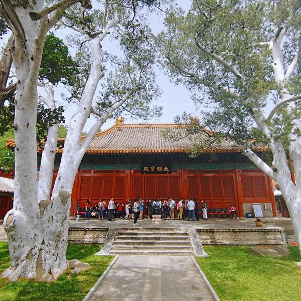 大雄宝殿前两棵千年白皮松被称为京城之最、活化石。图/穷游Biu主 黄师傅的悦生活