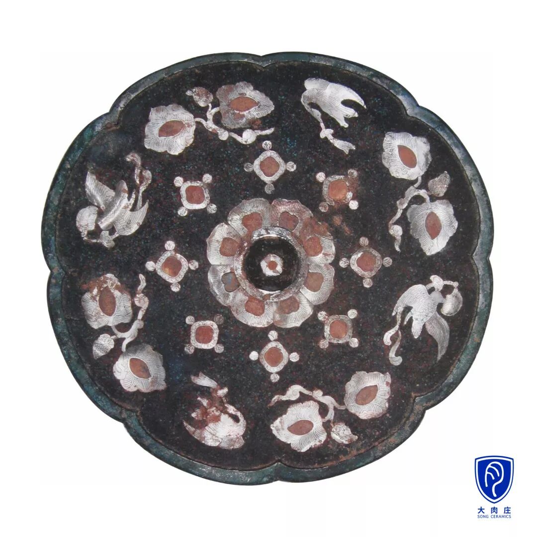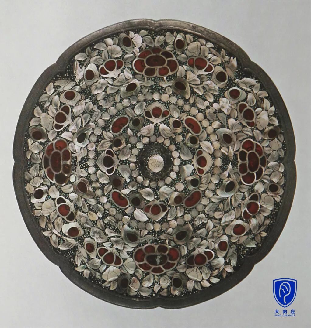 据考证,贝板为南海所产的夜光贝,花蕊系用云南一带的琥珀镶嵌而成,底纹敷以西亚的青金石碎粉,充分体现了唐朝文化的包容性。这面螺钿镜技法娴熟,构图满而不塞,纹样细部刻划入微,加之螺片本身光泽莹润,艺术效果十分突出,是唐镜中难得的精品。