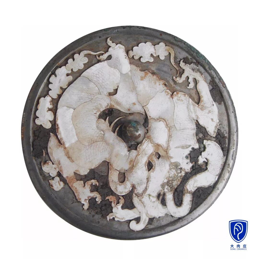 盘龙是人们喜闻乐见的唐镜题材之一,在唐诗中多有描写,如李白《代美人愁镜》:“美人赠此盘龙之宝镜,烛我金镂之罗衣。”孟浩然《同张明府清镜叹》:“妾有盘龙镜,清光常昼发。”盘龙图案不仅广泛表现于其他铜镜,也被装饰在螺钿镜上。该镜镜背主题纹饰为一蛟龙,龙首衔钮,身躯弯曲而上,前肢一伸一曲,二后肢与龙首相交。龙的周围饰有云纹,使之有腾云驾雾之感。龙的鳞、角、嘴、鼻、须、爪等施以非常精细的毛雕。龙体健壮,盘旋飞腾,体现了盛唐雄风。