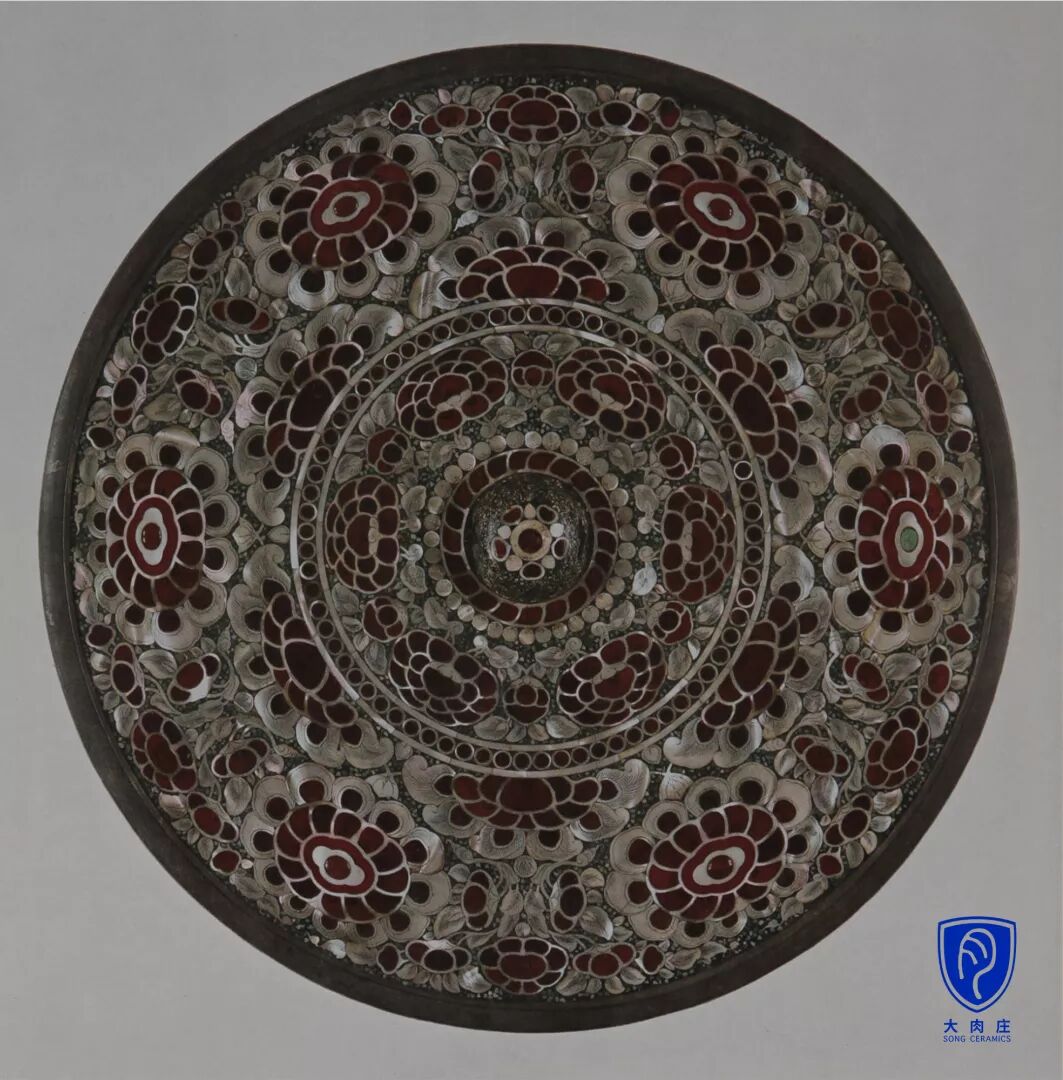 内区饰花蕾、莲叶纹,外区为四朵大莲枝,中间为盛开的花瓣以及繁茂的枝叶、蔓生的花蕾。整个纹饰由玉石、青金石、贝壳、琥珀组成,色彩艳丽,具有极强的装饰性。