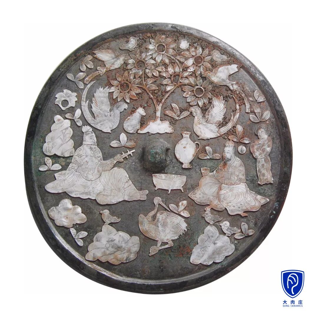 镜钮左右装饰两位高士坐于地毯上,左边一人弹拨阮咸,右坐者手持酒盅,面前一鼎一壶,相对弹饮。背后立一侍女,双手捧盒。白鹤随乐曲翩然起舞,池内岸边的小鸟驻足聆听。钮上方有株枝干粗壮、花繁叶茂的花树,树梢似银盘,树下一猫蹲坐憩息,两侧各一振翅翘尾的鹦鹉,满地落花缤纷,一派鸟语花香、温馨祥和的气氛。而图案的立意则有《高逸图》的意境:“枕明月而弹琴,望清风而缓酌”,以高士的闲情逸致和恬静的风景暗合文人意趣。此镜不仅装饰华丽,用料亦很考究。