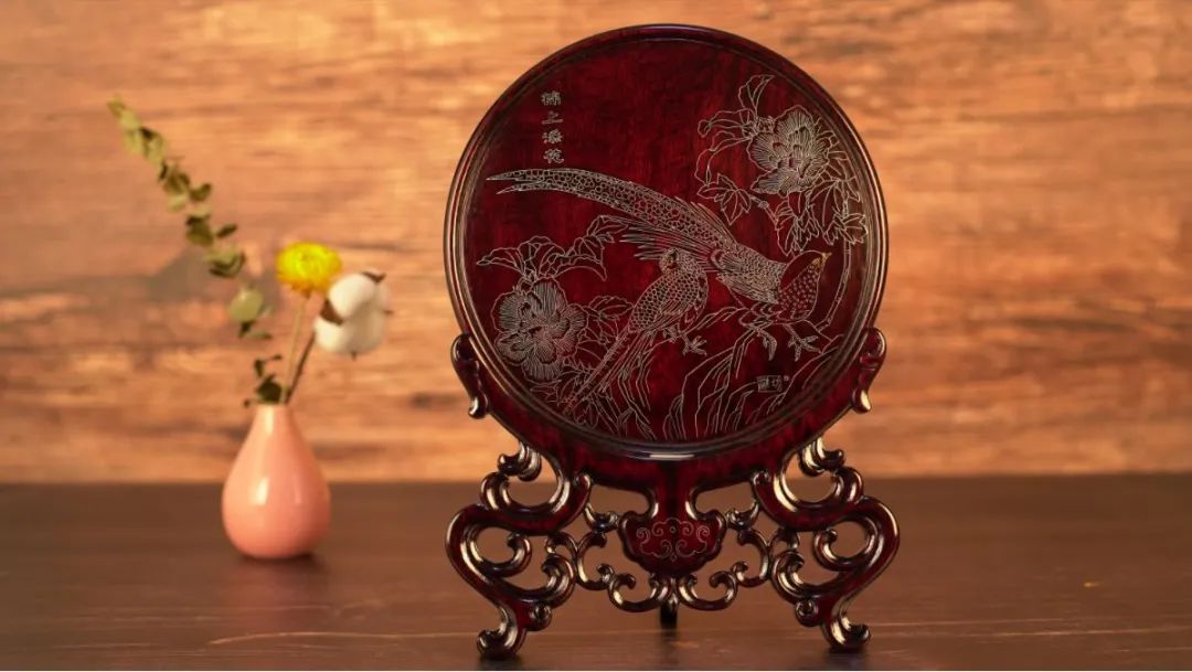 红木嵌银艳丽妆,潍坊匠心传岁月。漆器精华流光溢,华彩漆光映心灵。