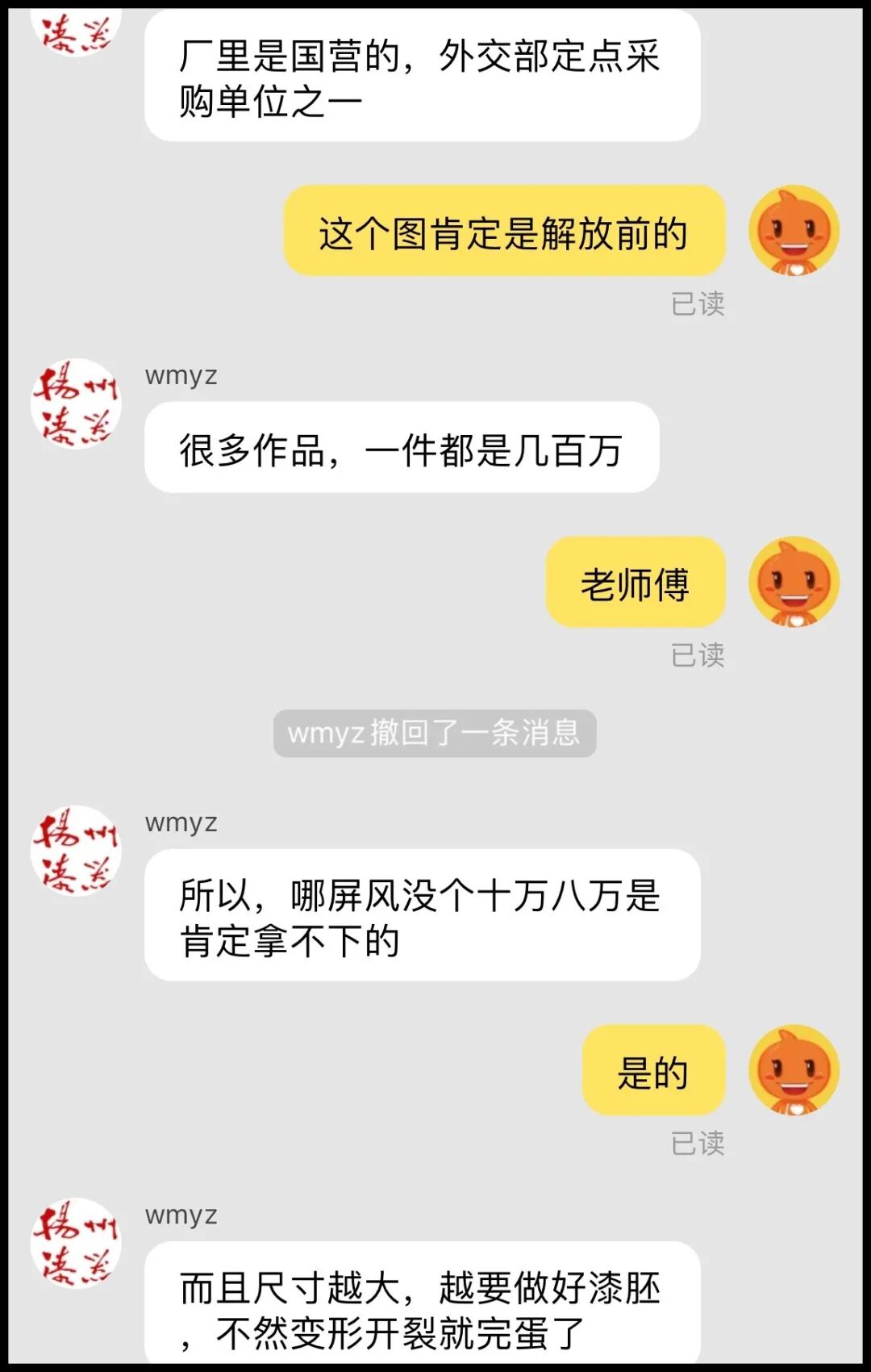 真心说,几千块的屏风后面的漆画一看就是比较行货,我想他们厂肯定有精品。