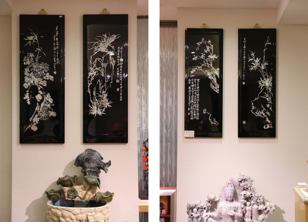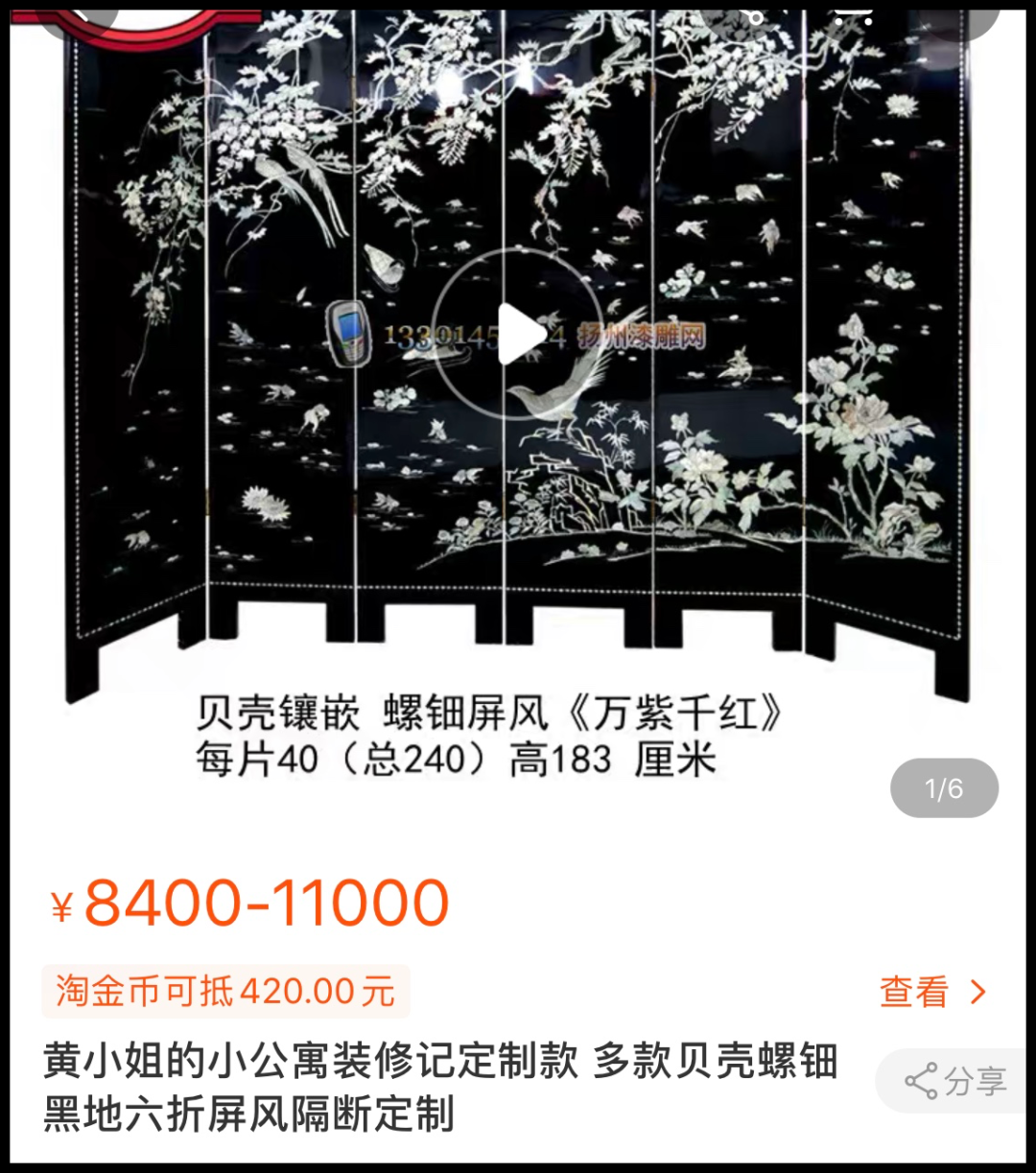 *转到这幅的时候发现居然只是4600,后来我问sales为什么这么便宜,而上一块挂屏要七万多,伊说镶螺钿的技法是一样的,但几千块的漆画屏风用的底材不一样,一般用高密度板的,乌木那种动辄几十万上百万,绝对是大户人家才用得起,所以日常大家用简版就好。
