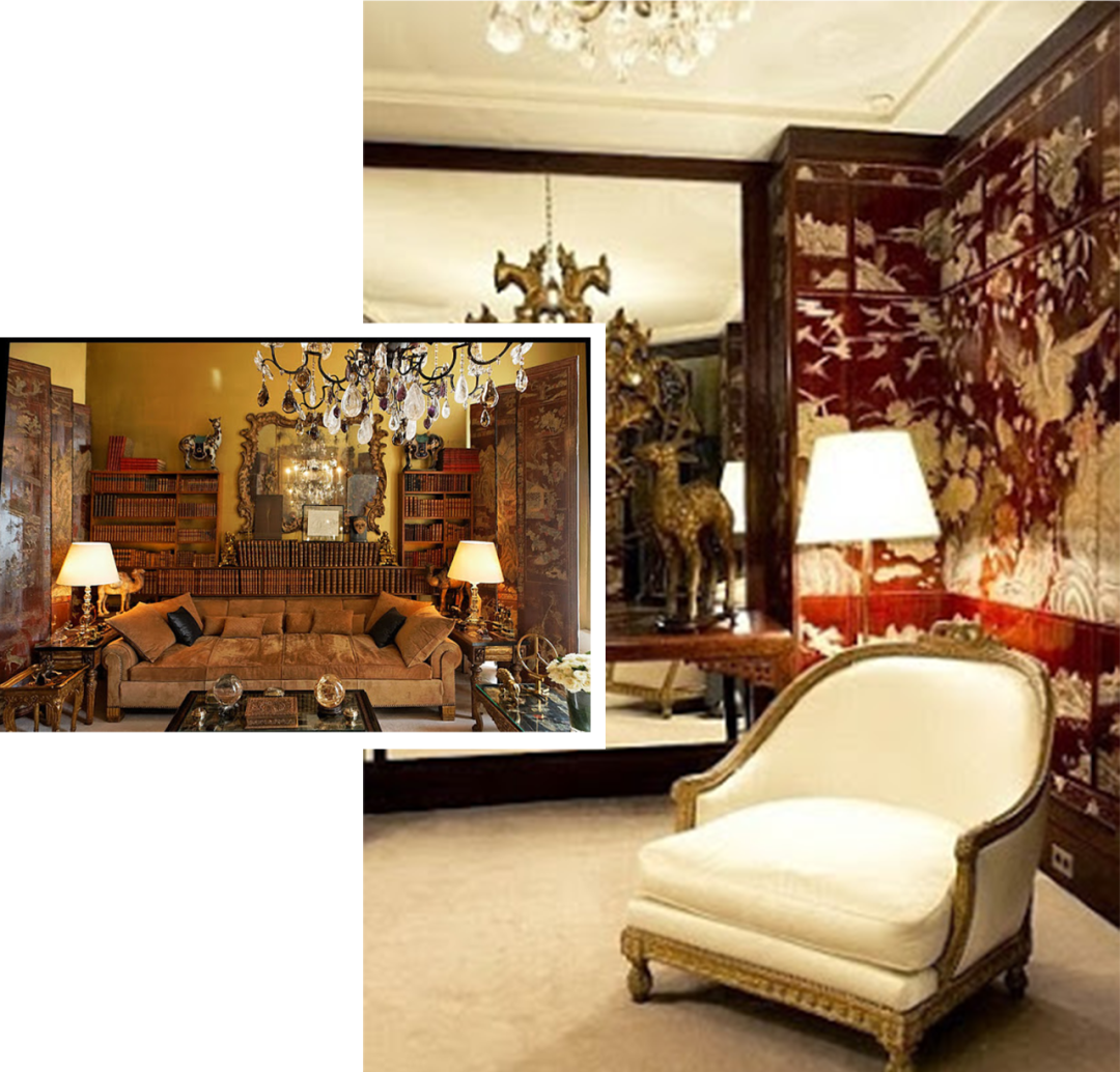 *Valentino Garavani 1932年出生于意大利伦巴第,他创立了华伦天奴那极为女性化和奢华的风格。他很钟爱中国的瓷器、屏风,以及在家中的楼梯走道上挂满了清朝皇帝的肖像,个人对中国家具的喜好非常鲜明。