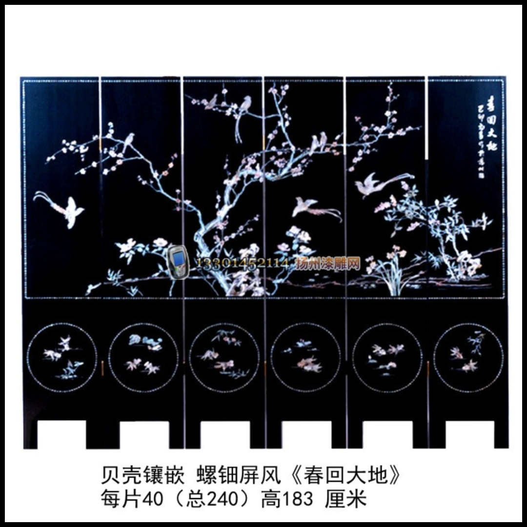 我房子小,只能做四屏,但我是在六屏的地方找到了我想要的图,叫“春回大地”。为什么选这个图案,其实就是贪图螺钿比较大。