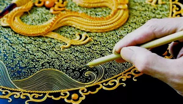 漆线雕最早被应用于佛像装饰。漆线雕为纯手工制作,相当繁复,工序上由原来简单的条、雕、刻发展到条、盘、缠、堆、雕、镂等十种纯手工工艺流程,一件产品需耗时几个月甚至数载的专业制作时间,做工精细雅致,形象逼真生动、风格古朴典雅,画面栩栩如生,且每件产品绝不雷同。