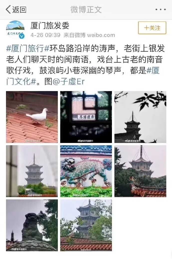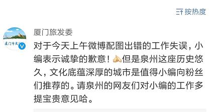 4月26日上午9点39分,拥有250万粉丝,被认证为厦门市旅游发展委员会官方微博的@厦门旅发委发了一条图文微博,把泉州开元寺、东西塔、麒麟壁等8张泉州特色风景图说成是“厦门文化”,虽然此后删了微博并在另外一条微博的置顶评论中进行道歉,但是仍然触动许多泉州网友敏感的神经。