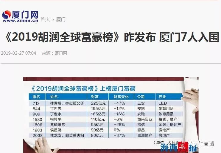 2019年福布斯富豪榜发布后,厦门网宣布厦门7人入围。不过,宣朗君在查阅此7人的资料后,林秀成、柯希平是安溪人,丁世忠、丁世家兄弟是晋江人,侯昌财是南安人,林龙安是惠安人,就算是黄曦家族所在的福信集团,也是永春人陈章辉所创建!