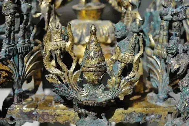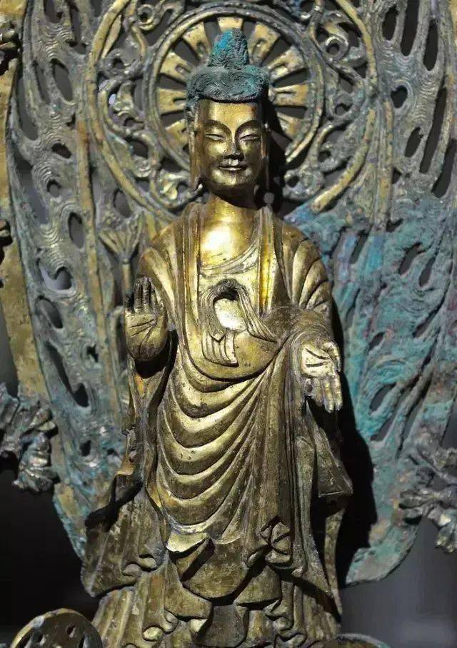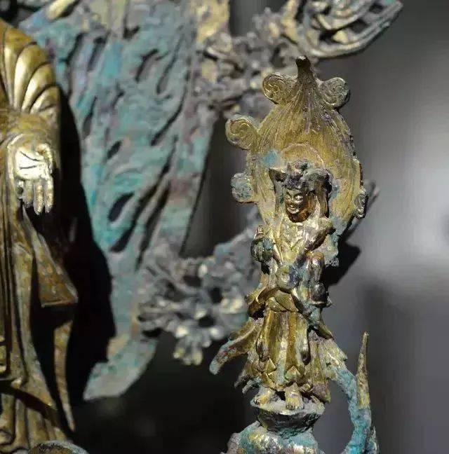 供奉弥勒佛像鎏金青铜祭坛局部特写,是了解这一时期佛像艺术的很好资料。