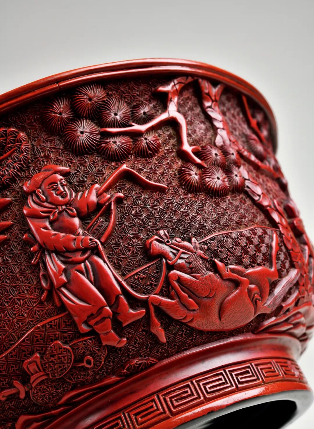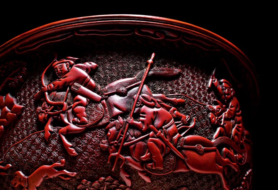 外壁髹层层朱漆剔刻纹样,花卉锦纹作背景,“卍”字锦纹作地,外壁剔红装饰锦地狩猎纹,山石松树掩映中有鹿群仓皇逃窜,有三人骑于马上手持兵器围猎,为首之人立于马上张弓欲射,腰间悬挂箭筒,中间一人持三叉戟,腰间悬挂一长刀,最后一人持鞭催马。马匹身姿矫健,四足腾空,马尾随风而动,疾驰形态栩栩如生,马身鬃毛装饰、马鞍、马镫皆刻画精细,纤毫毕现。