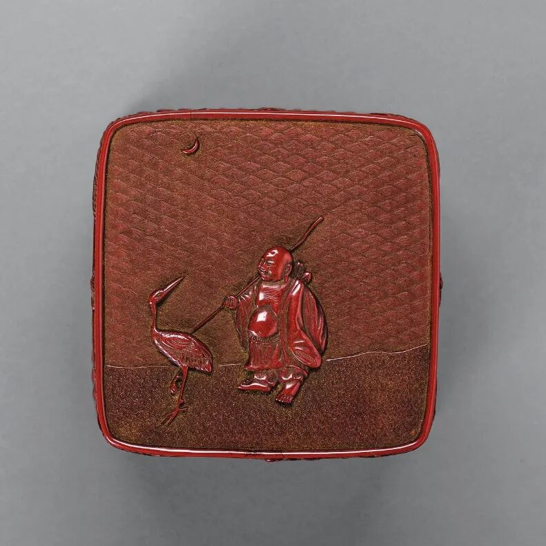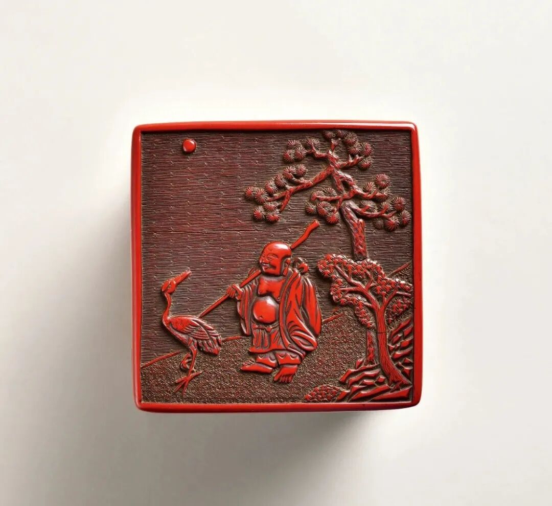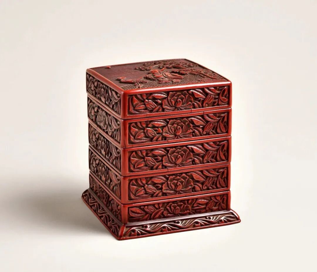 此件剔红放鹤图多层套盒,造型方正规矩,呈正方体形,连盖共五层,子母口层层相套,样式朴拙端庄。盒内及底髹黑漆,外壁髤朱漆剔刻纹饰。盖面随形开光内雕饰弥勒放鹤图,水波锦纹做天,龟背锦纹为地,古松之下,弥勒圆首大耳,坦胸露露,身披袈裟,肩背行囊,手执拄杖,赤足月下前行,其旁仙鹤驻足回首,一派宁静幽远之象。盒壁以赭黄漆为地,每层每面各雕牡丹花卉纹一组,皆是花肥叶厚,过梗穿枝,遮花压叶,妙处在于皆用刀纹样凌厉,却不失花容姣好,线条流畅均匀,藏锋不露。足墙饰卷草纹一周,流畅而富有生命力。
