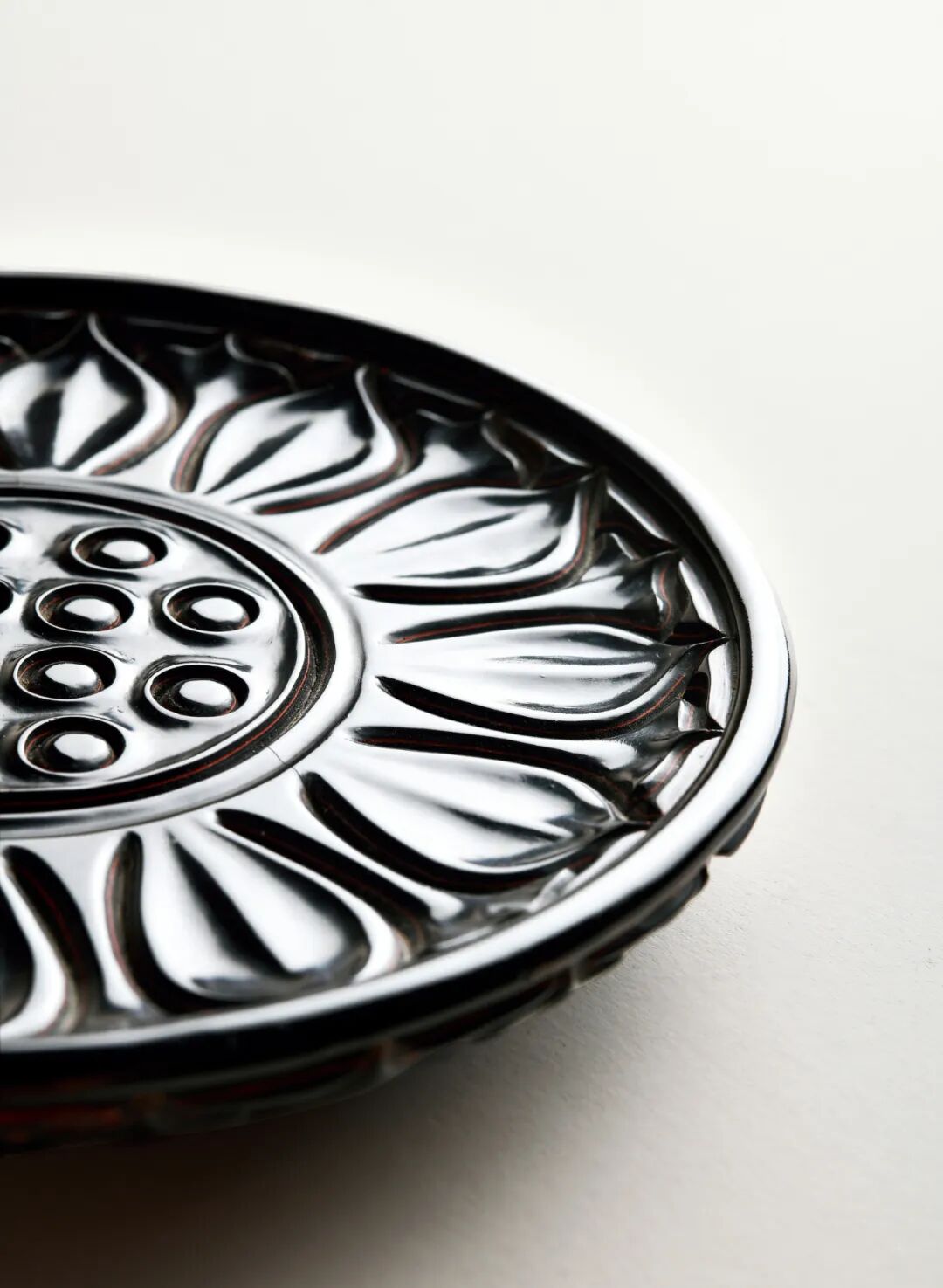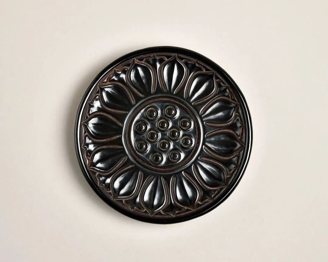 拍品以“乌间朱线”的剔黑工艺制作,整体作俯视莲花形,中心为圆形莲心,内有莲子十二颗,外壁莲瓣纹一周,瓣间心形犹如重叠花瓣,整齐中不失灵活,外壁则作桃形瓣。圈足略显高深。