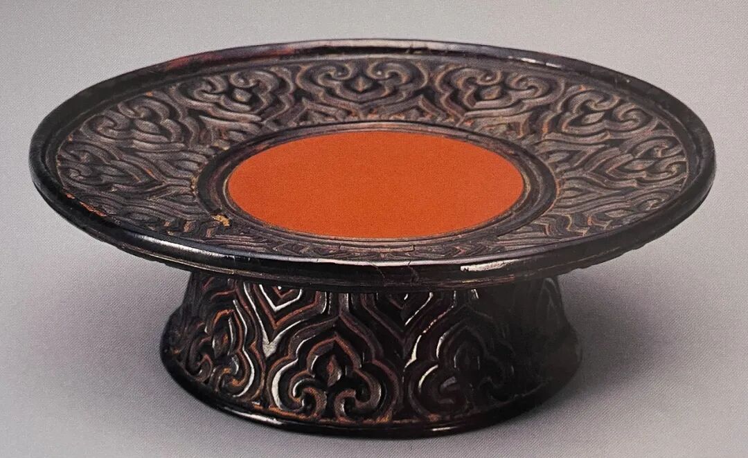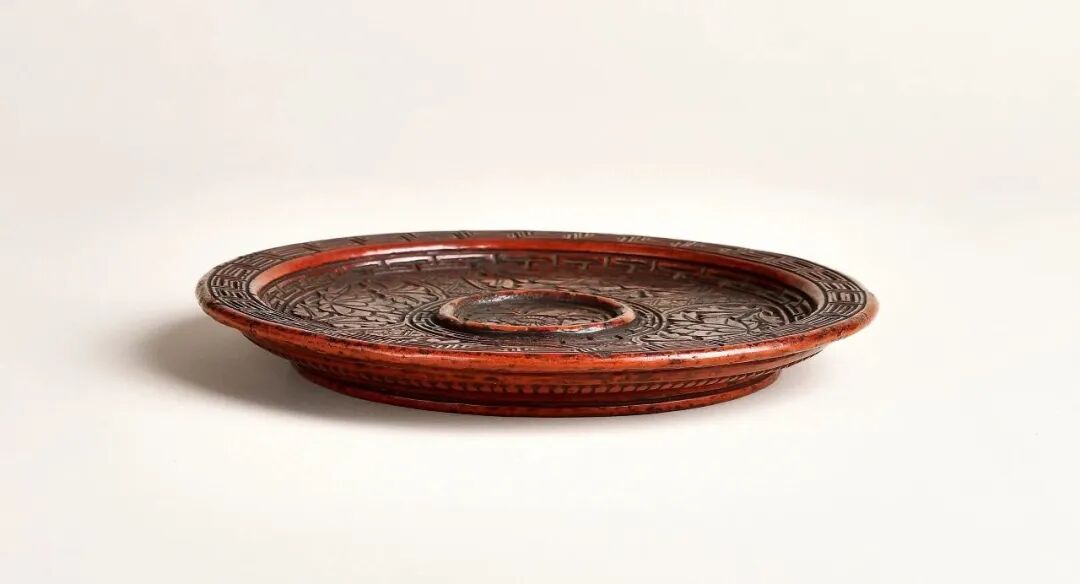 此盘造型舒展优美,尤以刀法古朴、圆润、敦厚见长,且用漆精道,髹漆厚重,纹样大气且具有文人生活意趣,全无后来雕漆作品那种掩饰不住的琐碎、萎靡的作风。正如明黄成《髹饰录》中写道:“宋元之制,藏锋清楚,隐起圆滑,纤细精致。”是件作品之上表现的淋漓尽致,是一件极其典型的元代漆雕佳作。