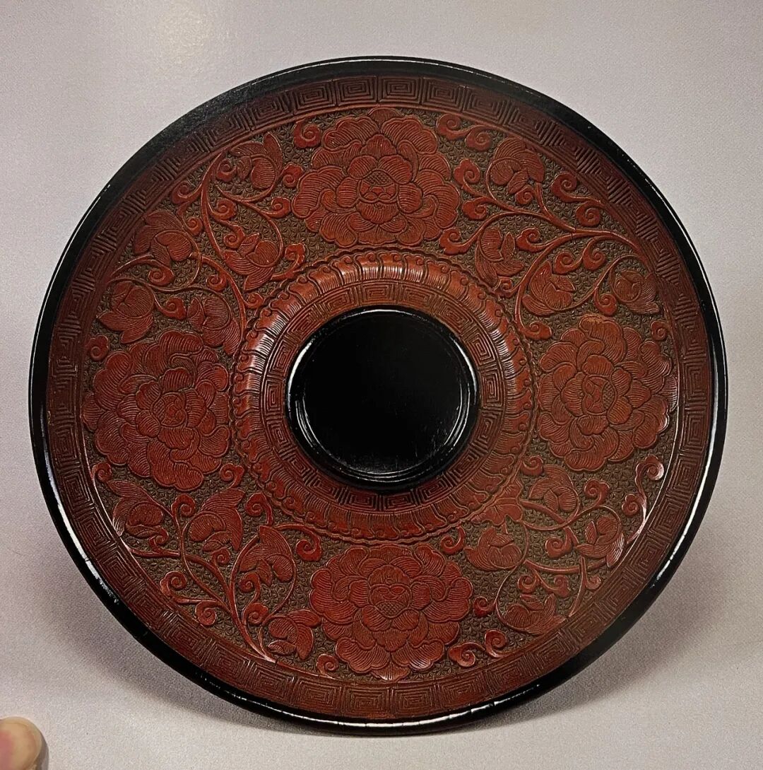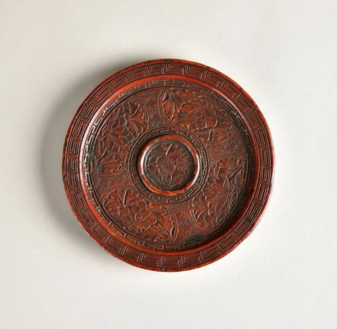 这件剔红圆盘呈折沿,弧壁,浅腹,浅圈足。通体于素地上堆朱漆刻花,以盘中央的牡丹为中心展开,分别铺垫城垛纹、菱花锦地上的四处开光花卉、拐子纹、折沿内外的回纹,以及外壁上排列的仰莲纹,刀锋刻画圆润而不显锋利,体现了宋代雕漆的典型样式,漆面色调偏暗,古朴的情调给人一种沉静安定的视觉效果。足内底面髹黑漆,展示出宋代素漆的风采。