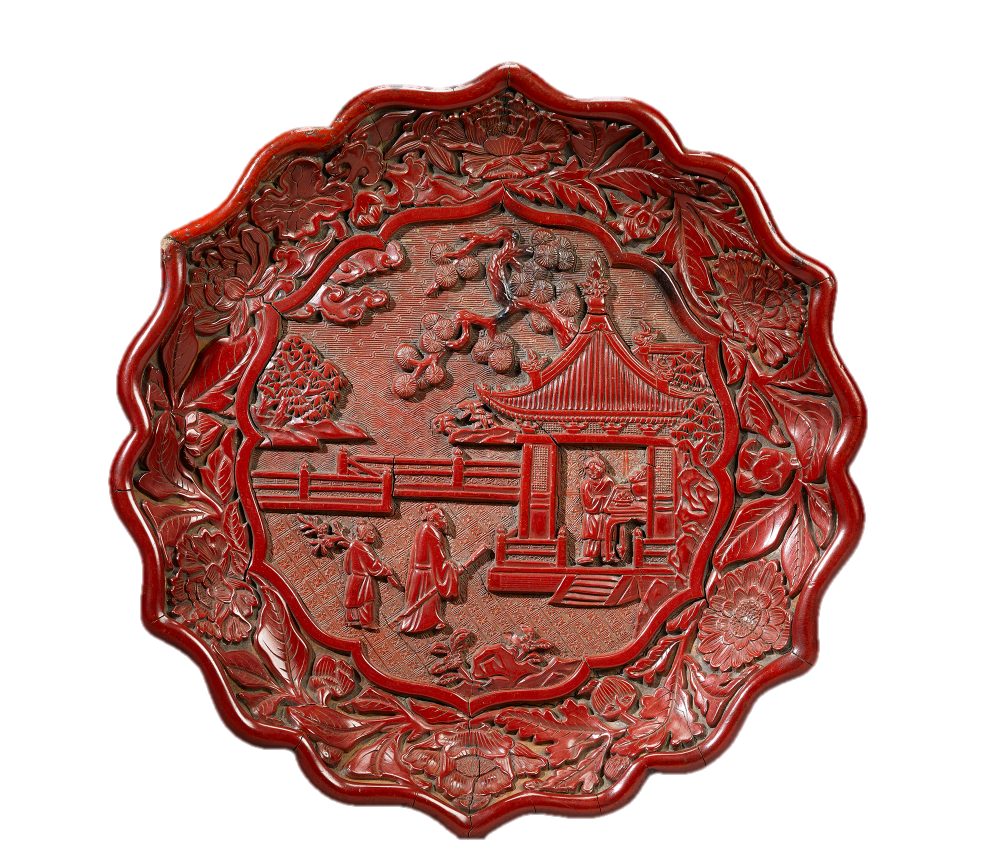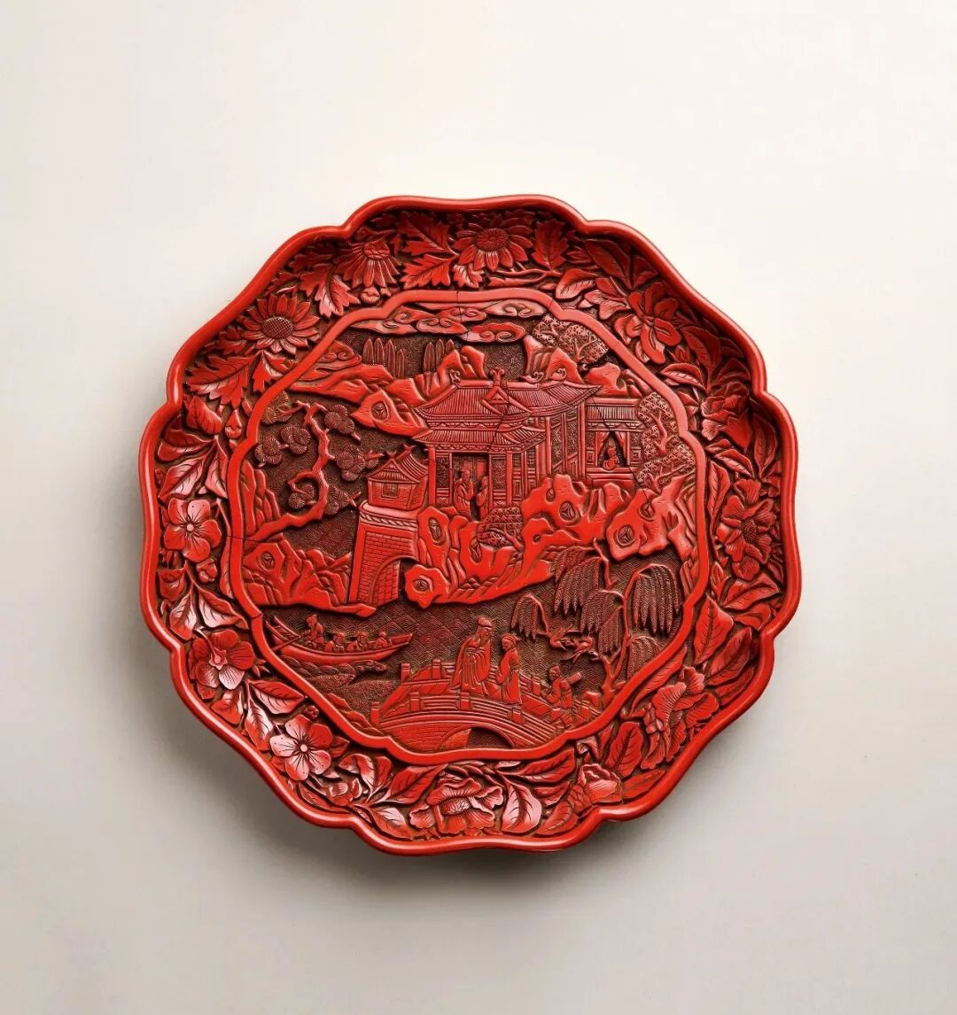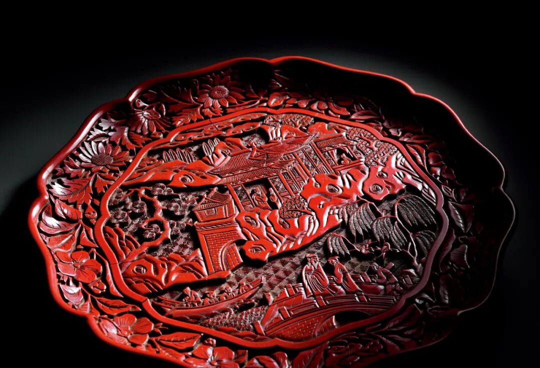 明 剔红山水楼阁人物纹葵式盘
