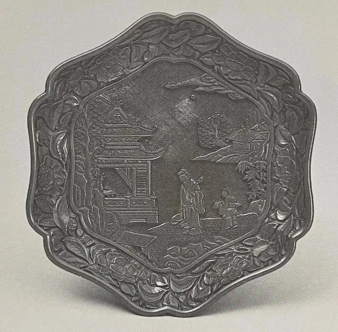 拍品之类,盘心山水楼阁、内外壁素地花卉的纹饰组合方式,时代特征鲜明,比较一例德川美术馆所藏元代六瓣葵式盘,收录于《雕漆》,根津美术馆、德川美术馆编,日本,1984年,页103,图140。