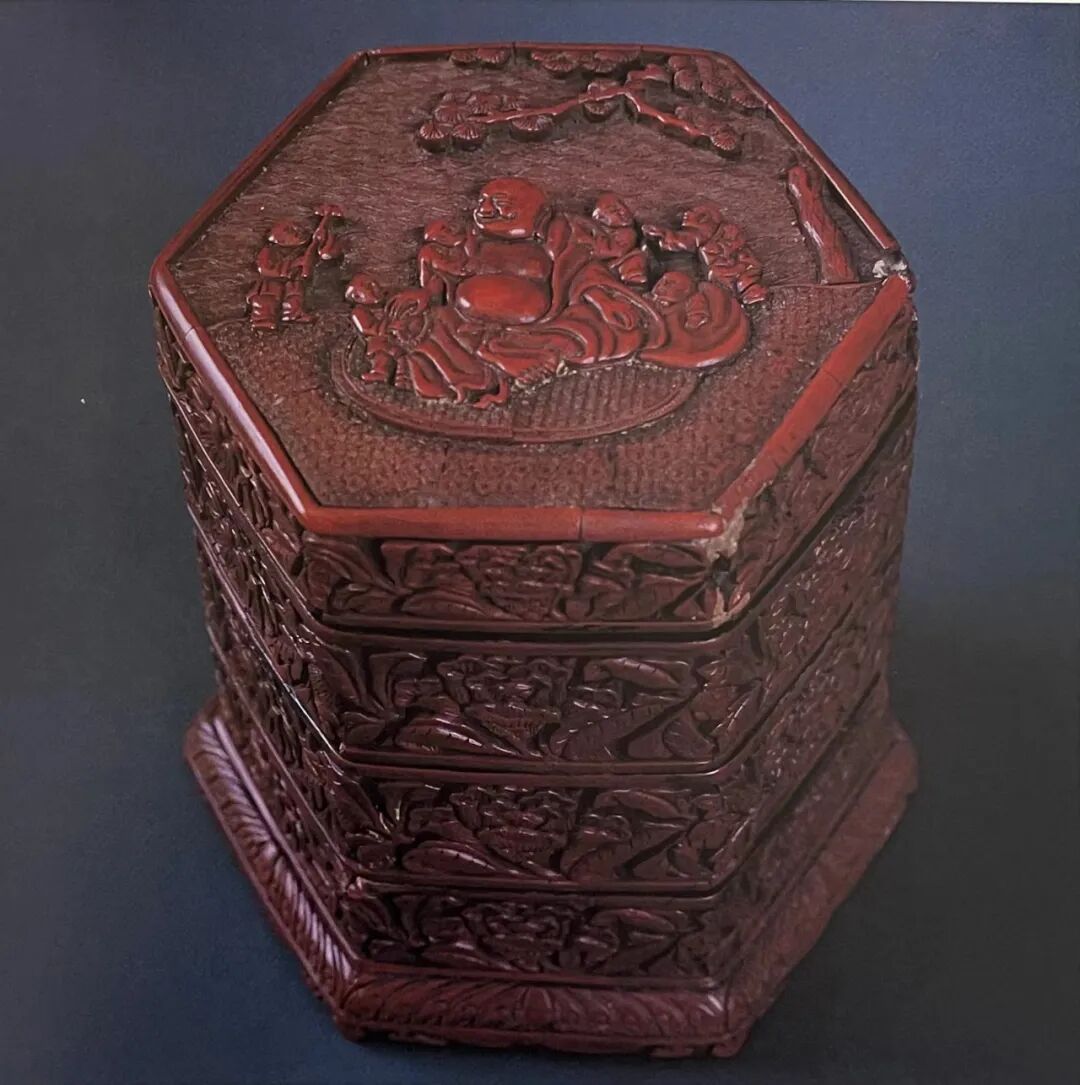 伦敦Derek Clifford收录 剔红弥勒纹六方多层盖盒