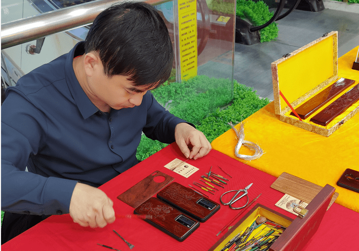 张国华告诉记者,他现在有一家属于自己的红木嵌银厂,每年制作大量的红木嵌银漆器以及家具,虽然有一些环节被机器所取代,但他认为尽最大可能的保留手工制作,是保持潍坊红木嵌银髹漆技艺的根本。张国华说,比如刻痕环节,用机器也可以刻,但机器刻痕粗细深浅都一样,很难表现粗细有别,疏密结合的效果,这样做出来的作品没有灵气,更谈不上艺术感。此外,张国华还尝试将红木嵌银漆器以更亲民更接地气的方式呈现。2019年,张国华突发奇想决定制作一批红木嵌银的手机壳,当时华为出了一款新型高端手机,他与华为销售商协商可以定制一批红木嵌银手机壳在新品发布中推出。双方一拍即合,张国华立即动手设计图纸,花了几个月时间,他共手工制作300套手机壳。张国华告诉记者,当时他只想尝试一下,希望通过这种方式消费者重新认识潍坊优秀的传统手造,没想到手机壳一亮相瞬间售罄,张国华说,这300款手机壳每一款都不重样,每一款都是独一无二的。