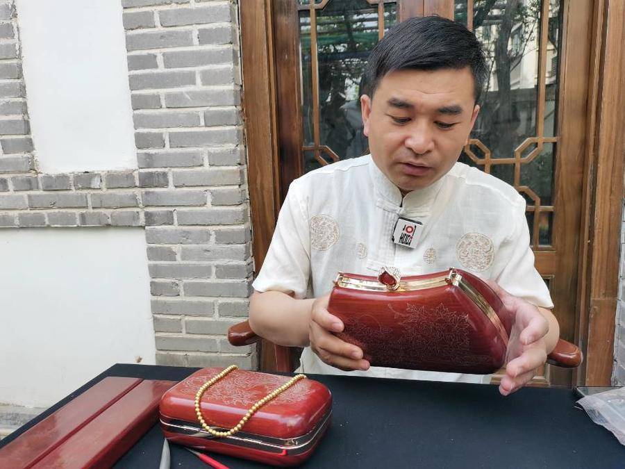 张国华用红木嵌银髹漆技艺制作的手包。
