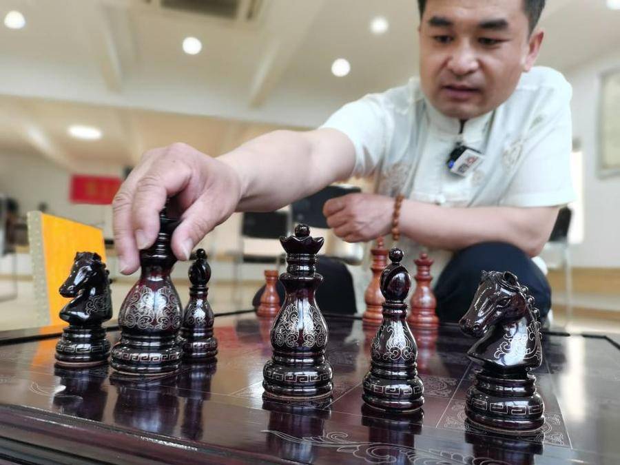 张国华用红木嵌银髹漆技艺原创的国际象棋。