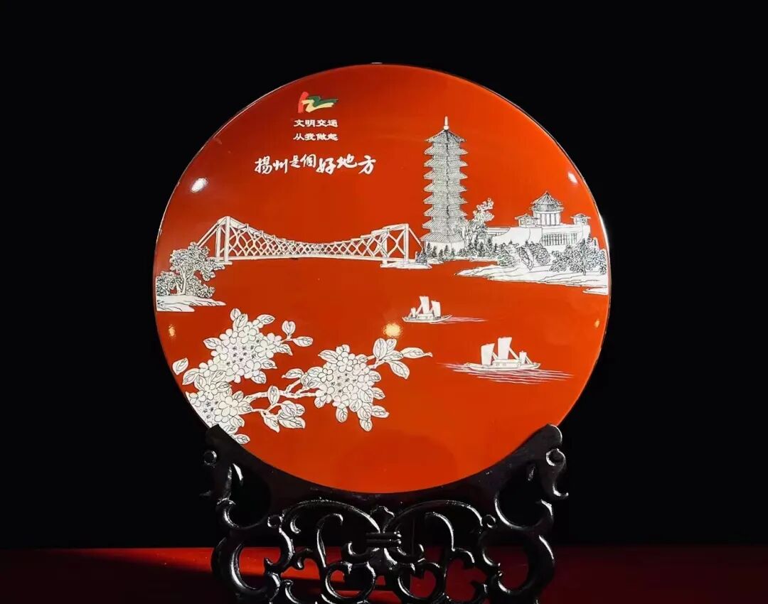 邗江公安分局交警大队委托扬州漆器厂,运用平磨螺钿特色工艺共同设计。经历贴稿、拉弓、打磨、 花纹、抛光五道工序精心制作了122“全国交通安全日”标志台屏摆件。摆件选用了扬州地标性建筑-三湾风景区和扬州市花-琼花为元素,辅以优质珍珠贝、云母、石决明等材料,打磨成不同色彩的薄片,再切拉成块面和纹样的钿片,平嵌在台屏上。