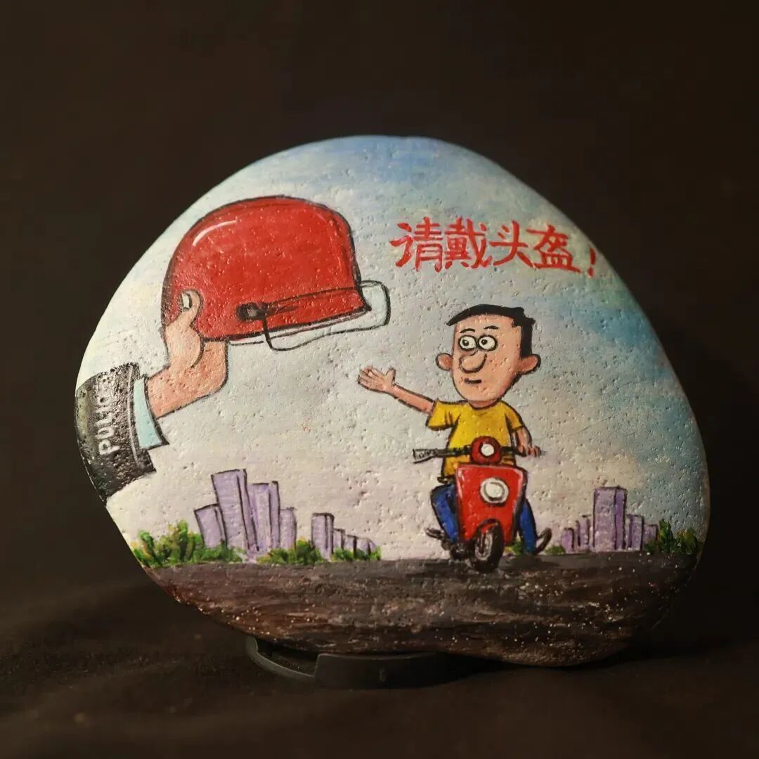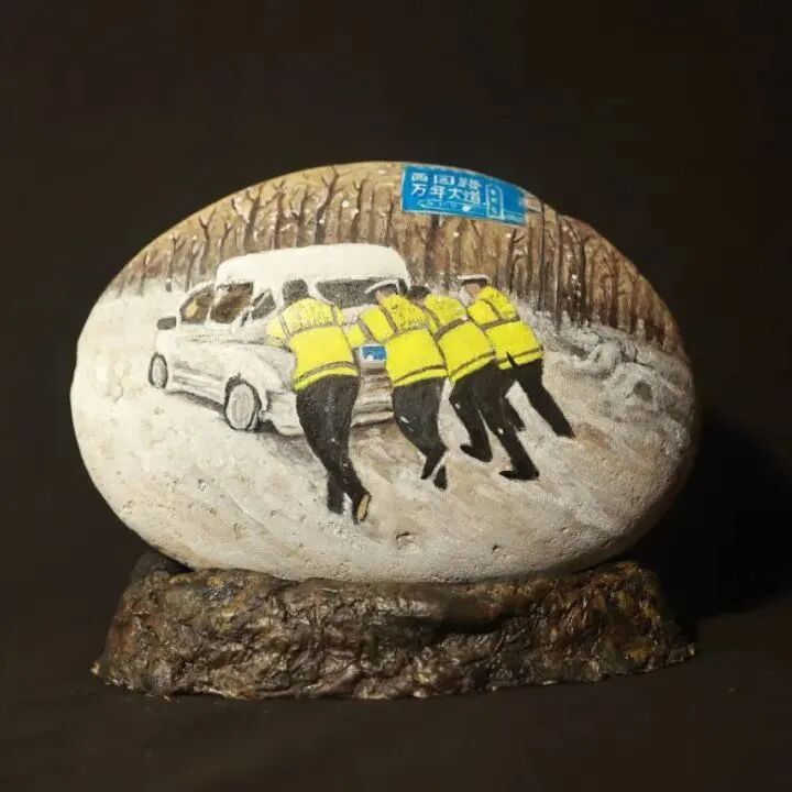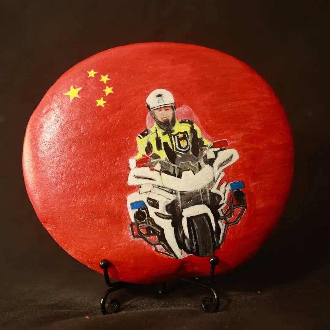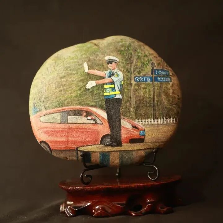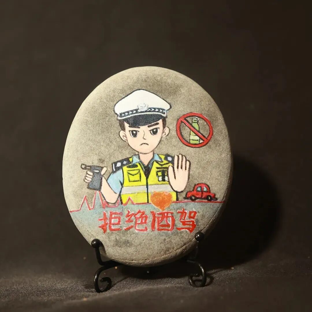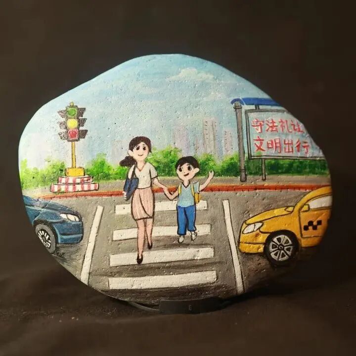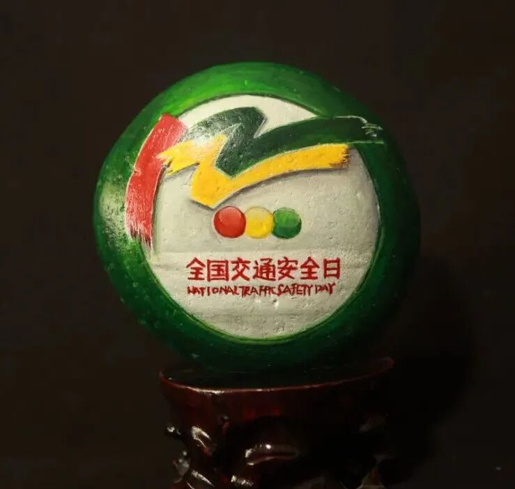 为弘扬传统文化与交通安全文化相结合打造具有仪征文化特色的交通安全宣传体系仪征市公安局交警大队专门邀请了仪征市非遗雨花石彩绘传承人刘燕老师创作《122“全国交通安全日”》雨花石彩绘作品。