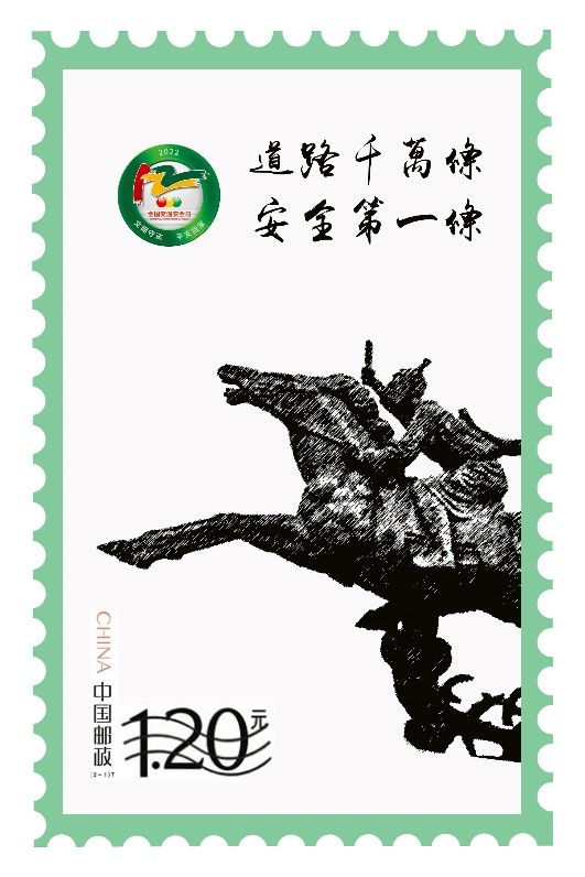 第一枚以城雕《邮驿之路》部分加工为古代驿使骑马疾驰传令画面,配122主题logo,宣传标语:道路千万条,安全第一条。第二枚以盂城驿鼓楼为图案,配122方形logo,宣传标语:文明守法,平安回家。邮驿文化和交通安全紧密联系,传统文化和现代文明交相辉映。希望小小的邮票承载着交通安全宣传,走进千家万户。
