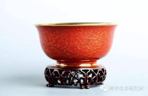 此碗以传统菠萝漆制作工艺精制而成,造型典雅,工艺精致。色泽华贵,极具宫廷皇家气势。碗口、足以纯黄金装饰,器身的红黑金三色搭配,彰显漆艺华美之风采。