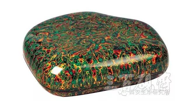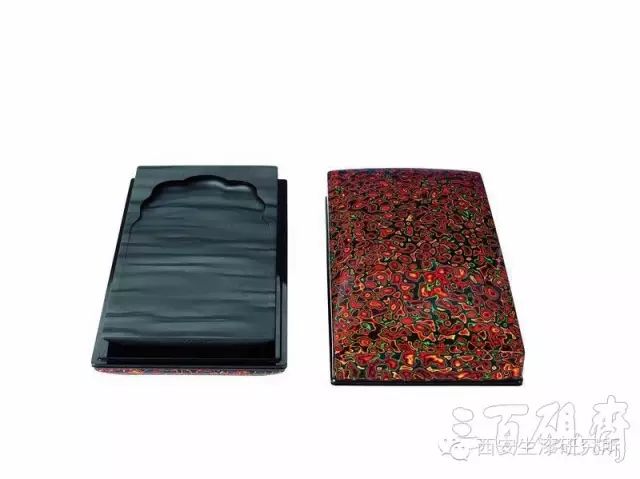 24厘米*12厘米*3.5厘米 犀皮漆盒随砚形而制,曲线流畅,柔美亮丽,精湛绝伦,胜似绝代佳人,况配此稀世之砚,珠联璧合!