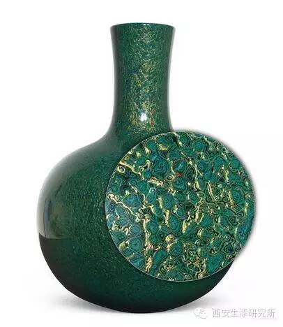 造型大气,形体饱满,以天然石绿,配以绿松粉末入漆。在金色的衬托下熠熠生辉,宝光十足。充满神秘般之色彩。菠萝漆中加入黄金的制作工艺是对传统技艺的一次突破和升华,属甘而可大师首创。