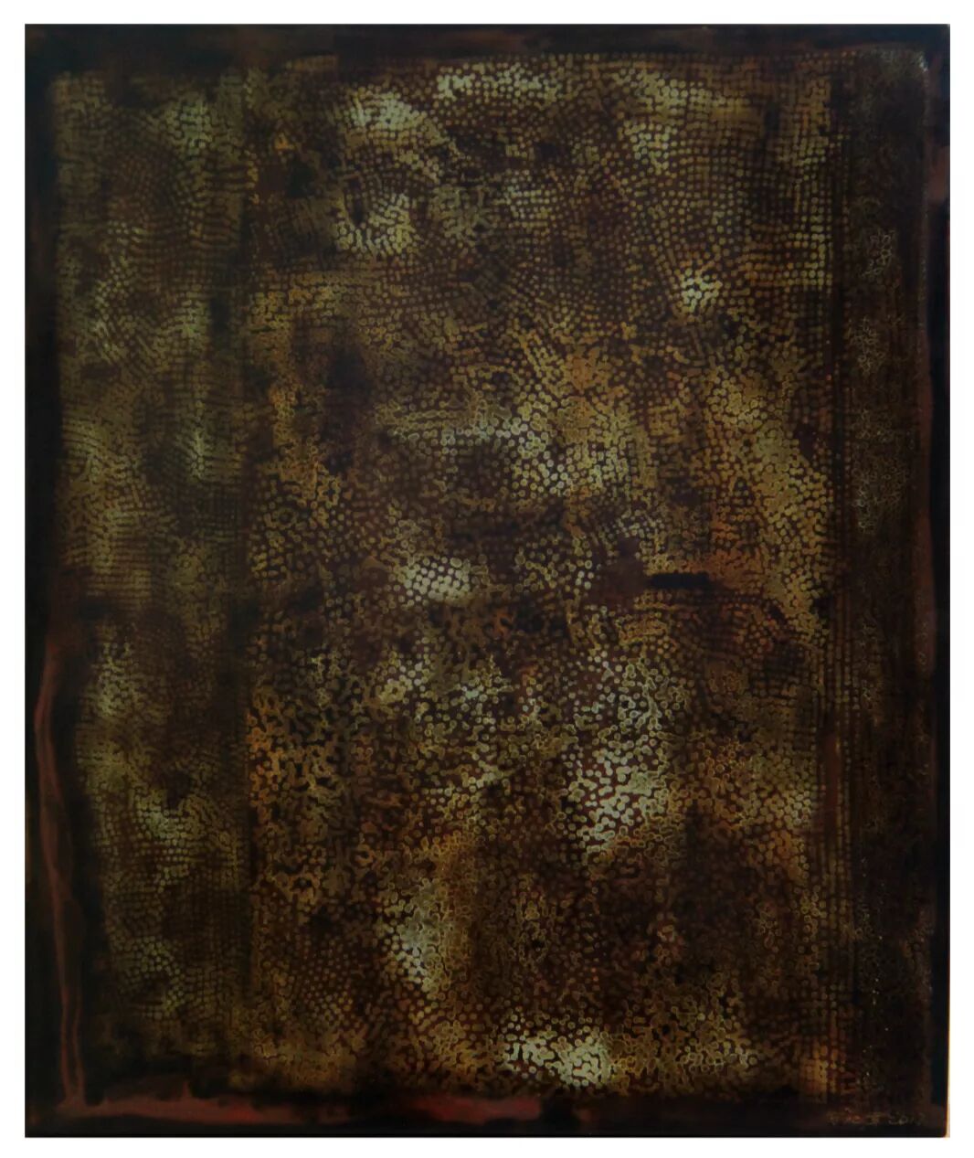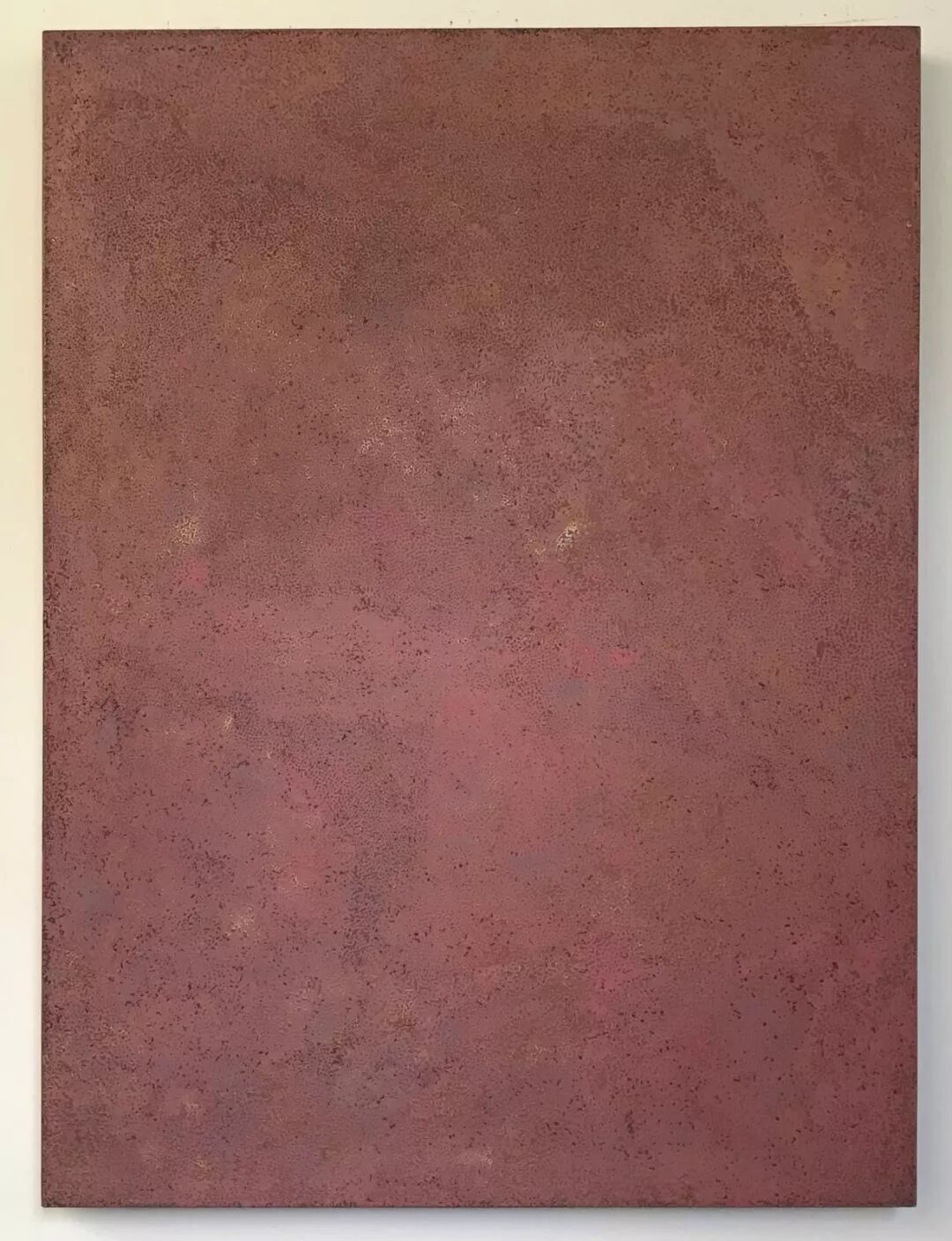 《集聚系列》作品,表现的是人每时每刻生活在色彩斑斓而又常常等于五色不分的一种状态,生活在延续,生命是缓慢集聚,也在随时无声消解,处处无意,却又处处留下微妙的痕迹,各种痕迹也在相互融合、彼此消解,又能不断生成新的迹象。翁纪军的漆画作品《集聚》,即是对色彩最细微处的琢磨与探究,而这种体验恰好与他的漆画技艺的特色相契合,为了让新的迹象于画面中渐次奥妙生成新的图景,他将漆艺特长的犀皮技艺发挥得淋漓尽致,不论是罩漆、研绘、喷染、薄涂,还是轻揩、推光,起捻、髹涂、打磨都不过是为了传达他将取自不同时间空域的状态迹象叠置重合为全新视界的意图,而一切景象与痕迹,都像他手中的材料一样可以随意转化交融……画面是平面的,但层次肌理却是丰富多重的,有些迹象是要覆盖的,而覆盖却非目的,他真正的目的还是要于覆盖之后再重新发现,这里的时间是并置的,也因此它们才会在各自凝止的状态下重获流动的能量与意味,其中隐含的多重空间是纹理暧昧的,在很大程度上也正是这种暧昧才能与流动的时间一道生成了这异样的生活迹象。