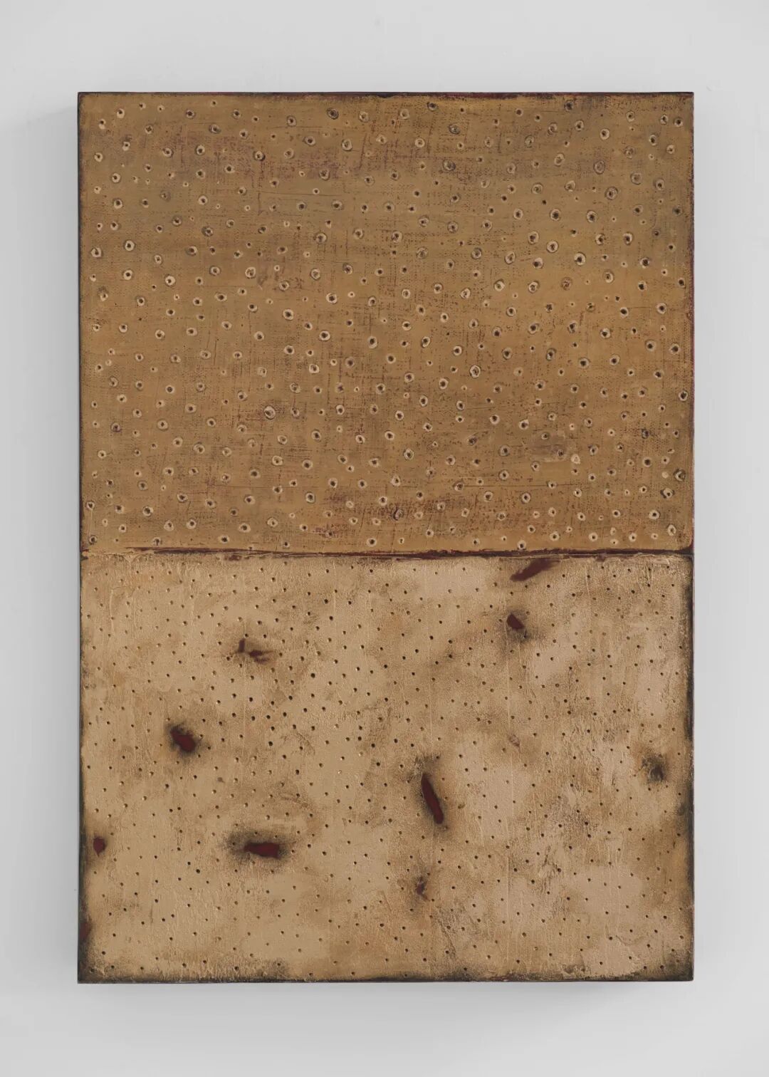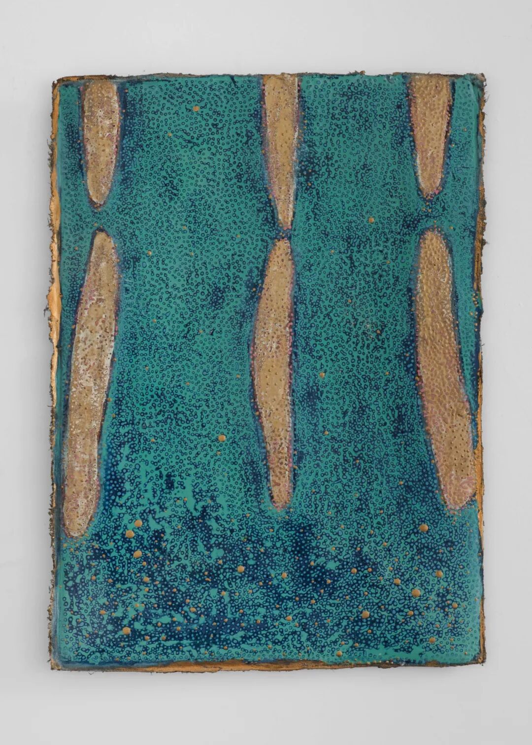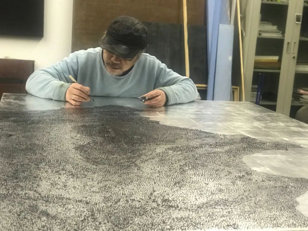 画面中满布的那似犀皮非犀皮,似金虫非金虫的密集圆点形成一种小到微观细胞大到宇宙浩瀚无垠的空间图像表达,揭示着病毒把人隔离开又把人放置于共同的处境中的当下。色彩之间丰富的层次感既有大漆反复髹涂的厚度,也有层层覆盖打磨所形成的相互穿透,如同弗罗伊德所说的一种“穿刺式劳作” (durcharbeitung):“在穿刺工作中我们拥有的唯一引线就在情绪(sentiment)中,或更确切地说,在对情绪的聆听中,只言片语、零碎信息、某个词语就这样降临了。”