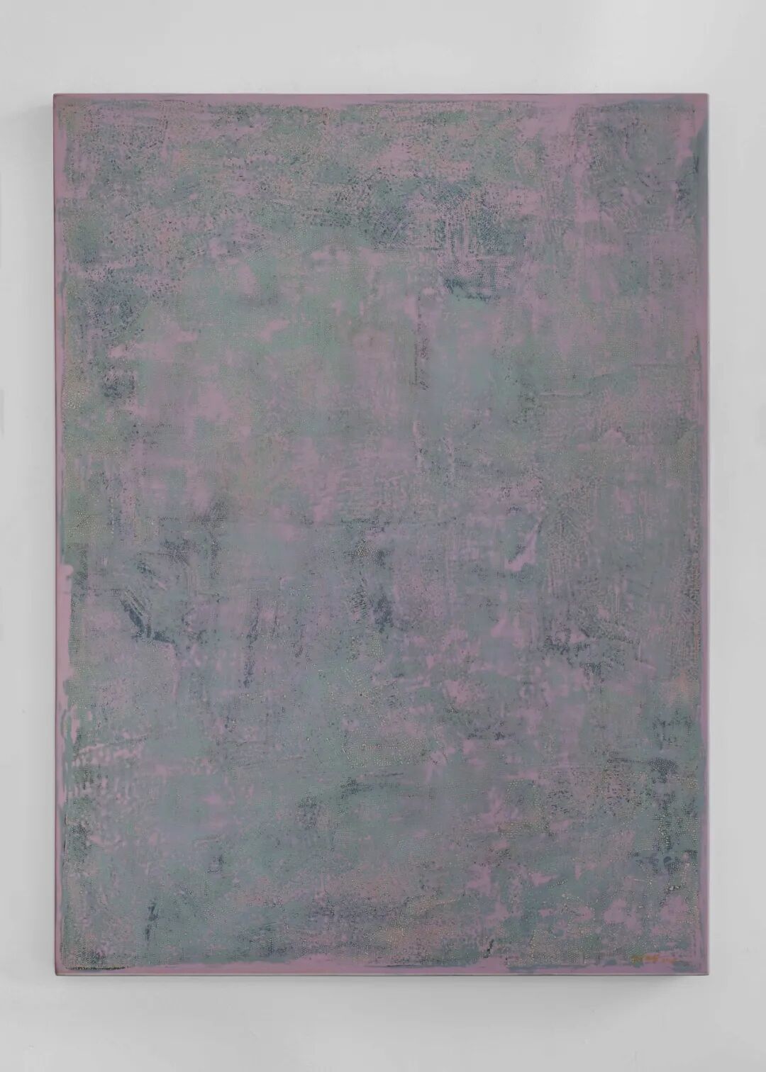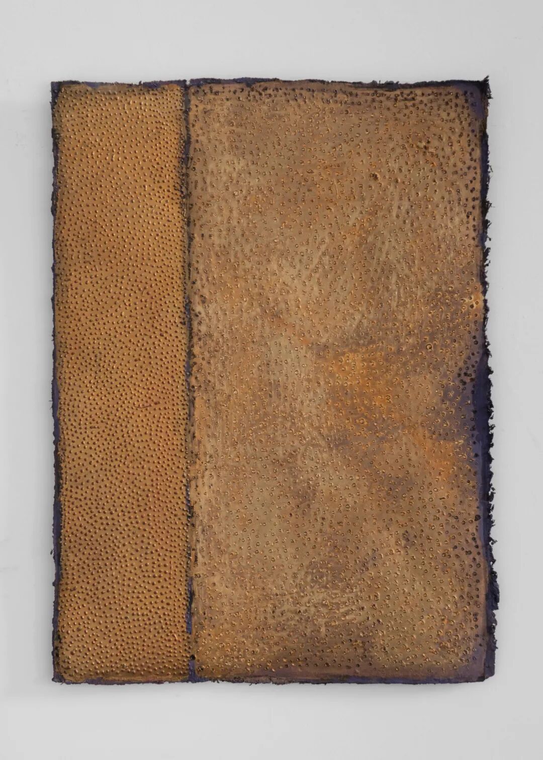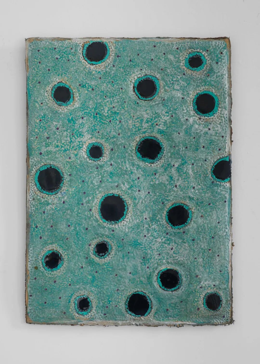 画面中满布的那似犀皮非犀皮,似金虫非金虫的密集圆点形成一种小到微观细胞大到宇宙浩瀚无垠的空间图像表达,揭示着病毒把人隔离开又把人放置于共同的处境中的当下。色彩之间丰富的层次感既有大漆反复髹涂的厚度,也有层层覆盖打磨所形成的相互穿透,如同弗罗伊德所说的一种“穿刺式劳作” (durcharbeitung):“在穿刺工作中我们拥有的唯一引线就在情绪(sentiment)中,或更确切地说,在对情绪的聆听中,只言片语、零碎信息、某个词语就这样降临了。”