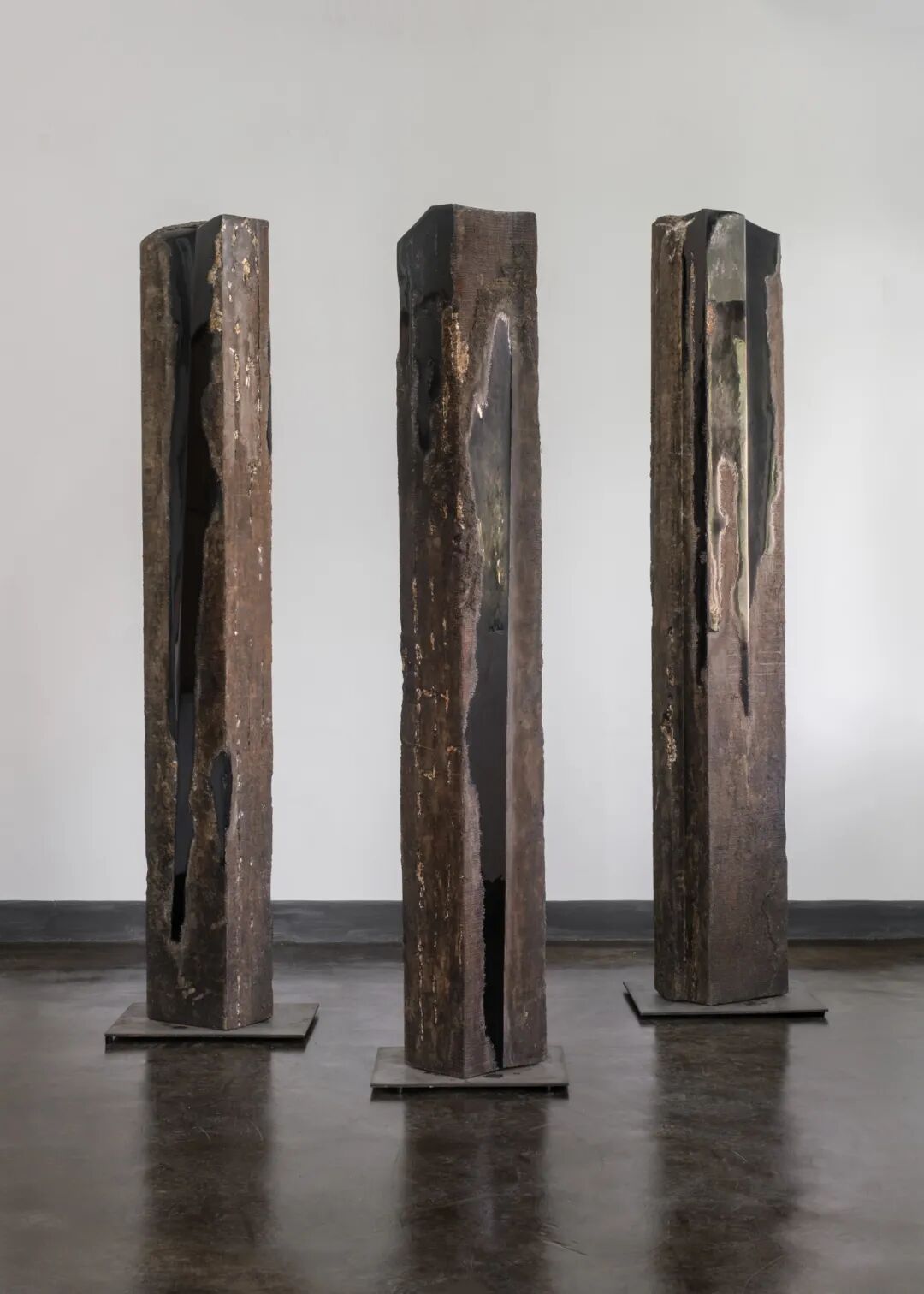 ▲翁纪军《矗立 2018》213x24x32cm (左)、199x22.5x25.5cm(中)、206x23x28cm(右)