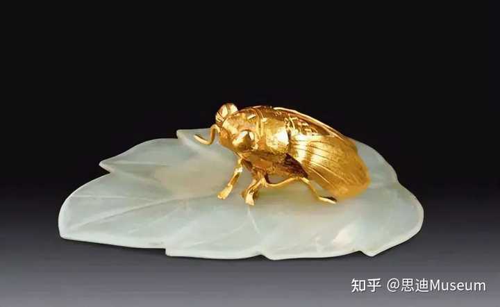 金蝉玉叶长5.3厘米 重4.65克,于1954年出土于苏州五峰山博士坞明代弘治年间进士张安晚家族墓地14号墓。金蝉采用了压模铸范、薄叶延展、錾刻、焊接等工艺。玉叶汲取传统的阳线、阴线、平凸等多种琢玉工艺,抛光细腻,薄胎圆润,琢工精致,达到炉火纯青的艺术境界。整个画面构思奇巧,动静结合,妙趣横生,具有极高的鉴赏价值。