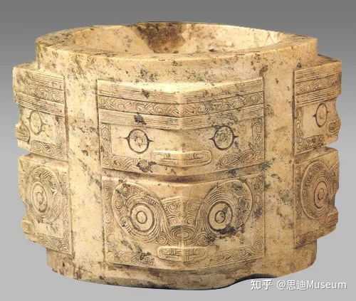 人面兽面组合纹玉琮属于新石器时代良渚文化(公元前3300~前2200年),乳白色,有青灰色斑块。矮方柱体,内圆外方,圆孔由两头对钻而成,孔壁光洁。四角大于90度,分为上下两节,各琢刻上下不同的纹饰。玉琮的上节为戴羽冠的人面;下节象征兽面。以繁密的卷云纹作地。构图复杂,雕刻精细,为玉琮中的一件精品。