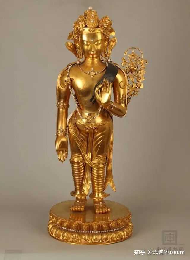 清代金立佛像为清宫遗物,似为藏教首领进贡之物。佛像为喇嘛教佛像,通高88厘米,用41斤纯金打造而成,上面还点缀了不少珍珠和宝石,工艺精湛,佛身与莲座皆装饰华丽,嵌珍珠宝石,雍容华贵。