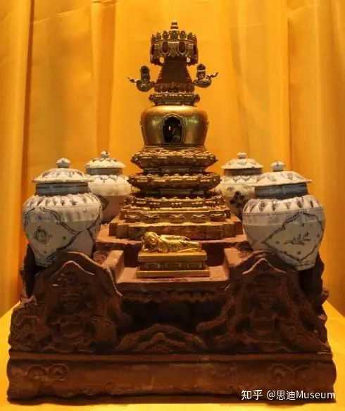 鎏金喇嘛塔,塔高35厘米,座高16厘米,底边83.5厘米,塔置须弥宝座上。座正面刻有二力士像,右刻双狮戏球,左刻双鹿斗角,后刻云龙。塔座下枋刻有题记:“金陵牛首山弘觉禅寺永充供养”,背面则是“佛弟子御用监太监李福善奉施” 。